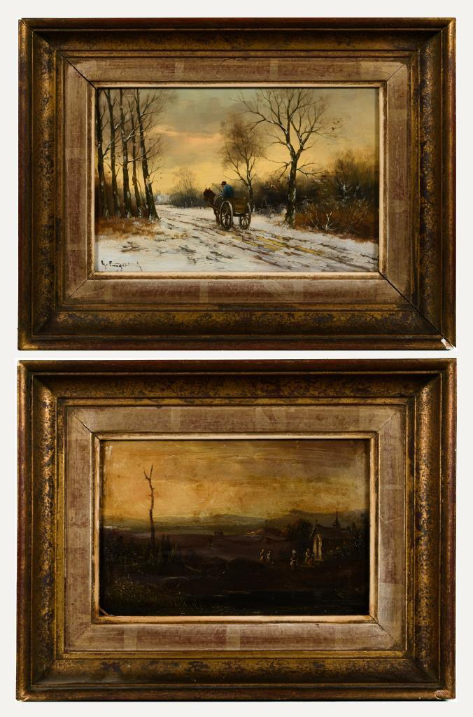 Weite Landschaft mit Kapelle und Staffage am Abend sowie Fuhrwerk im Winter am Waldrand.