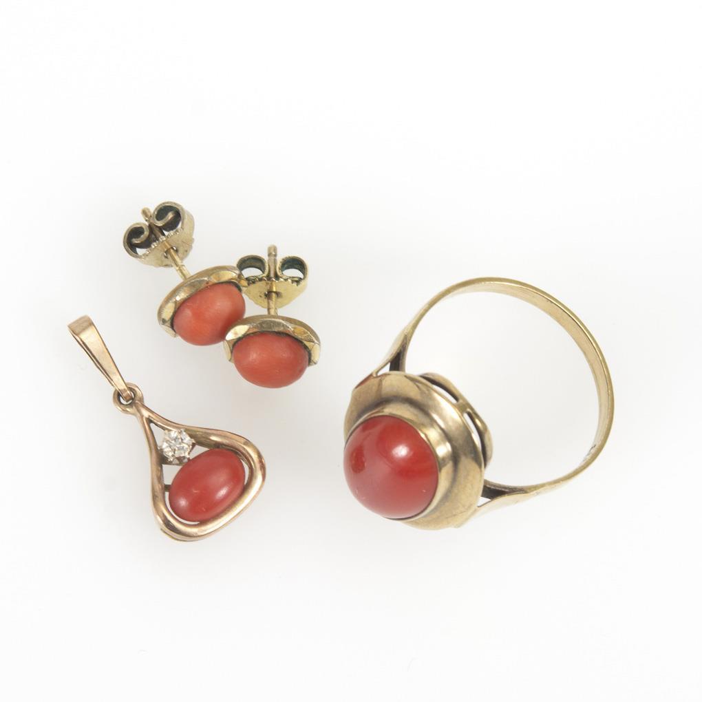 Ring, Anhänger und Ohrsteckerpaar (Metall) mit Korallencabochons. Schmale Schiene. Steckmechanik.