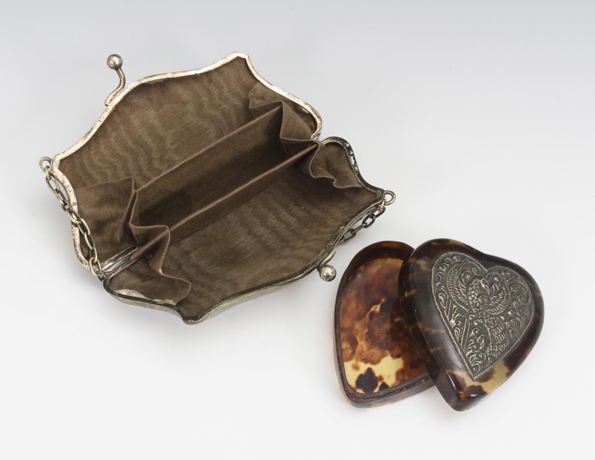 Floral gravierte Geldbörse an kurzer Kette. / Herzförmige Schildpattdose mit geprägter Silberauflage. 1x minimal gedellt.