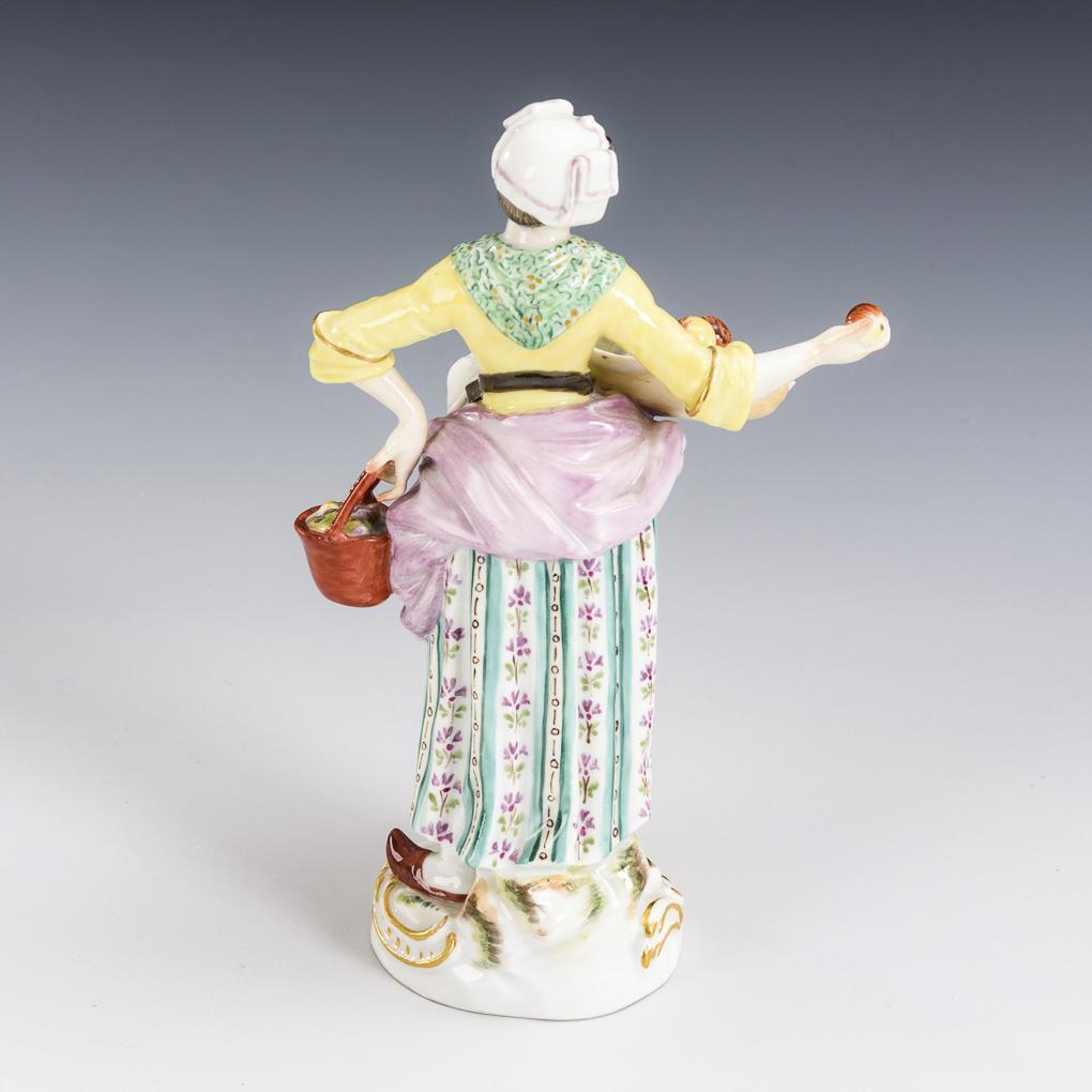 Pariser Ausruferin mit Äpfeln und Pflaumenkorb. Minimaler Chip am Stand.
