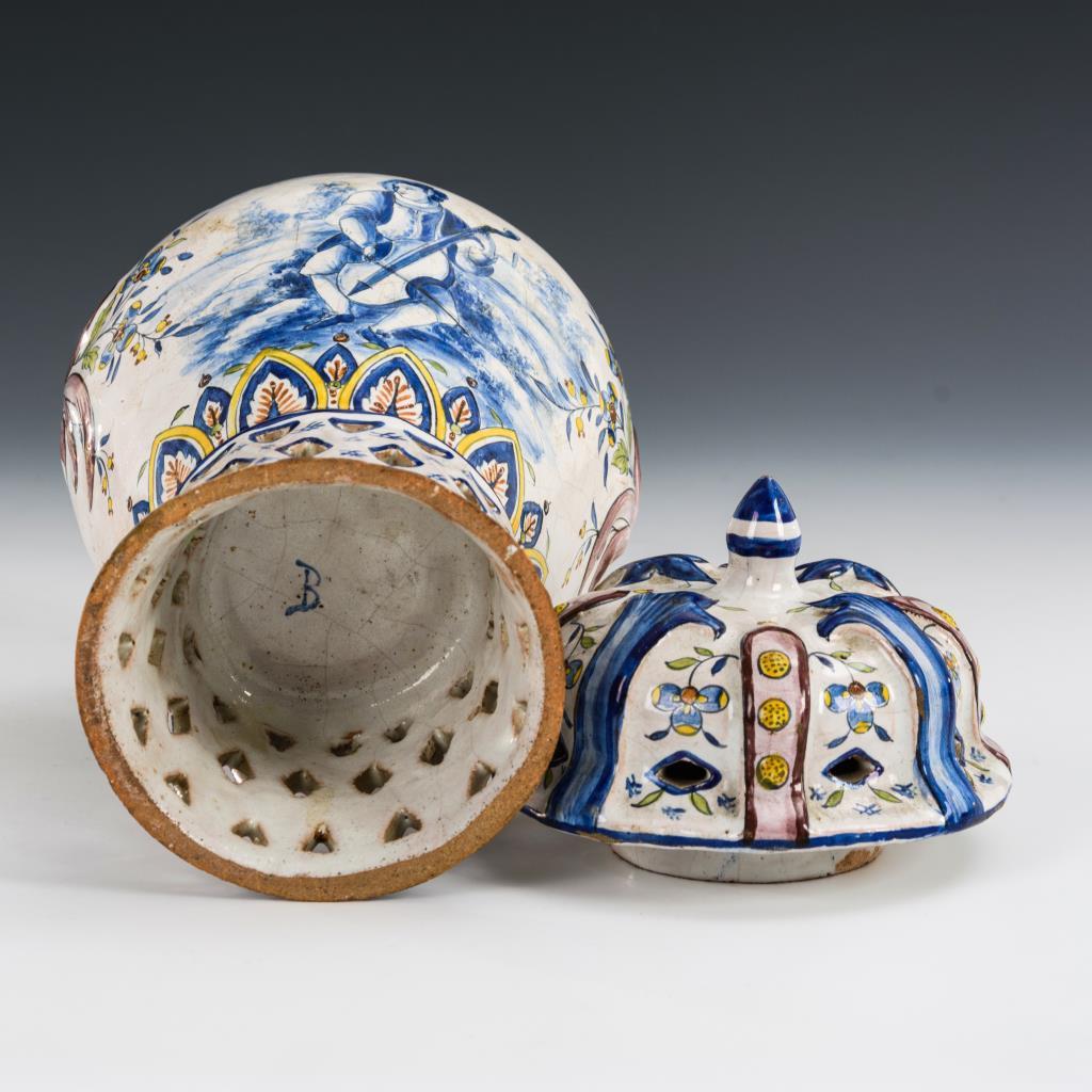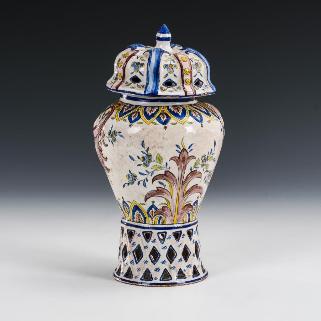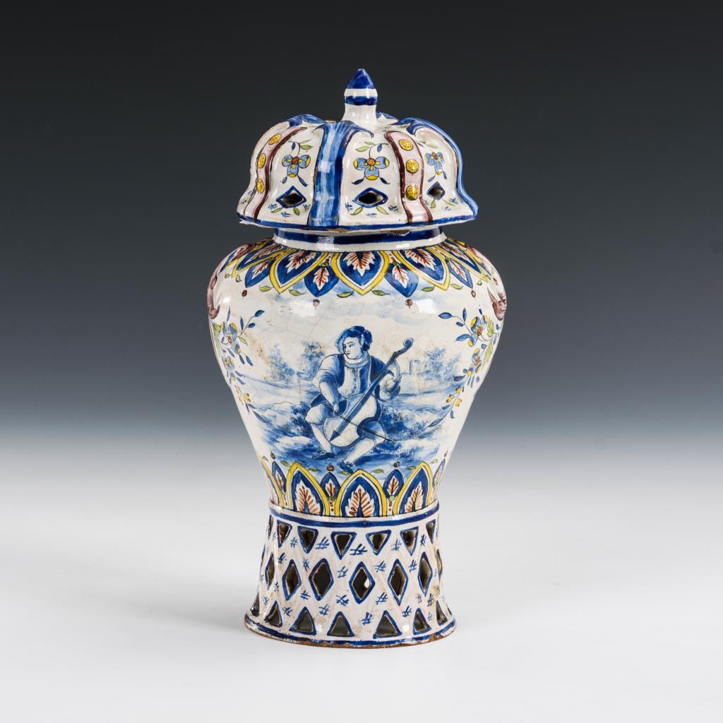 Balustervase mit durchbrochenem Rundstand und Reliefdeckel mit Zapfenknauf, schauseitige Ansicht eines musizierenden Mannes, umgeben von Floraldekor. Restaurierter Vasenrand, leichte Randbestoßungen, Glasurbereibungen.