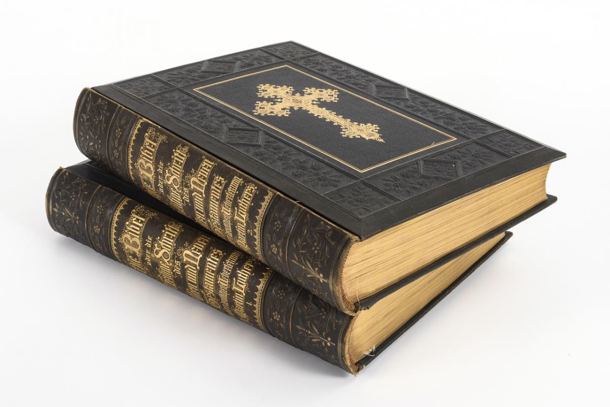 2 große Bände mit goldgeprägten Einbänden und Goldschnitt sowie hundert chromolithographierten Vollbildern nach deutschen, italienischen, spanischen, holländischen und französischen Künstlern und einer Haus- und Familienchronik.