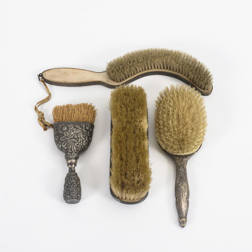 Gemarkte Haarbürste und 3 Tischbürsten, teils reliefiert, 1x gepunztes Ornament. Teils stark berieben/verputzt.