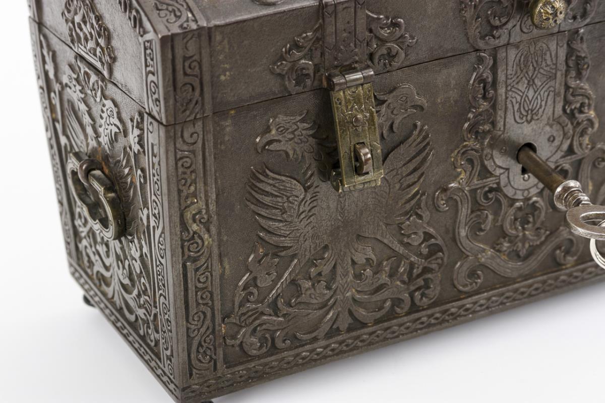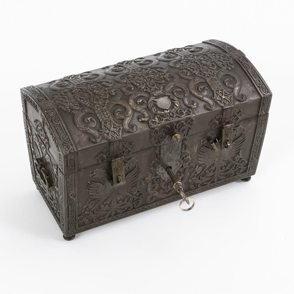 Im Stil der Renaissance allseits und auf dem Scharnierdeckel mit Reliefornament verzierte Truhe.