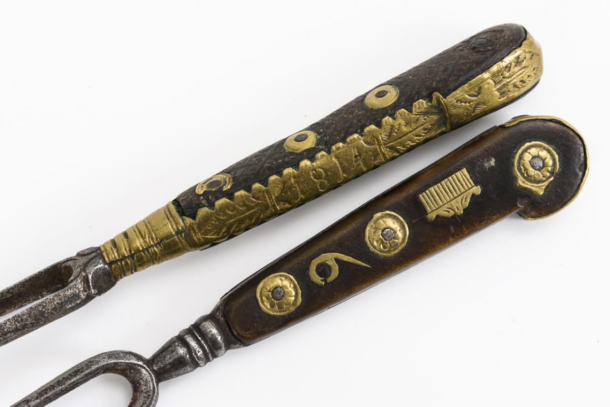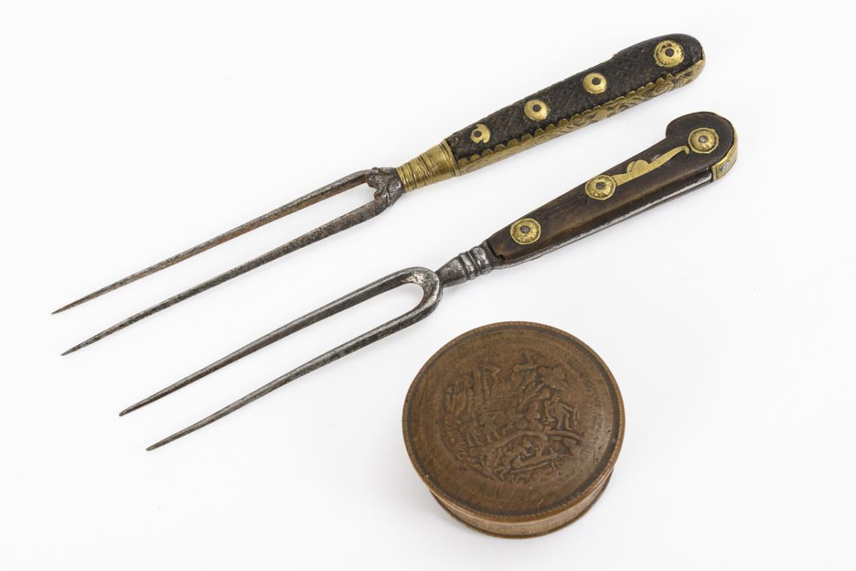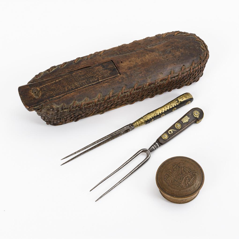 Korbgefäß mit Holzboden und Schiebedeckel im Holzdeckel. 2-zinkige Gabeln mit graviertem Messingbeschlag bzw. -einlagen. Drechseldose mit (geprägter?) Jagdszene auf dem Deckel. Gefäß mit Anobienspuren, wenige Fehlteile am Messing, Jagdszene berieben. Je Alters-/Gebrauchsspuren.
