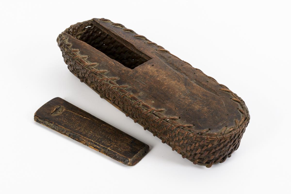 Holz, Weide, Messing, Stahl, Horn. Korbgefäß 5,5 x 27 x 9 cm.