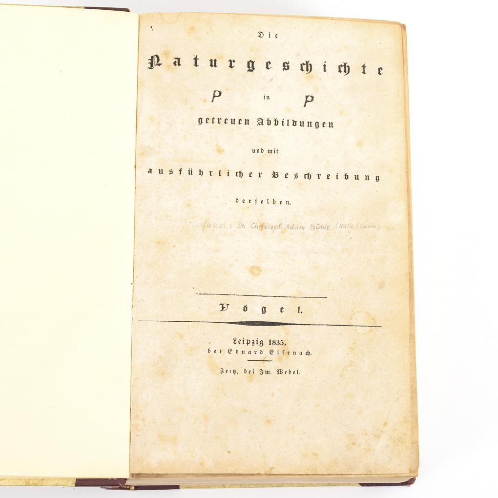 Erschienen bei verschiedenen Verlegern: Leipzig, bei Eduard Eisenach / Zeitz, bei Im. Webel / Halberstadt, bei Carl Brüggemann / Pesth, bei Otto Wigand. 254, (4) Seiten und 183 Lithographie-Tafeln mit Vogel-Abbildungen, nicht koloriert. Band jünger nachgebunden in weinrotes Halbleder. Eine Registerseite restauriert, mit etwas Textverlust und eine Abbildungsseite mit stärkeren Knitterspuren. Sonst Block in altersgemäß gutem Zustand.