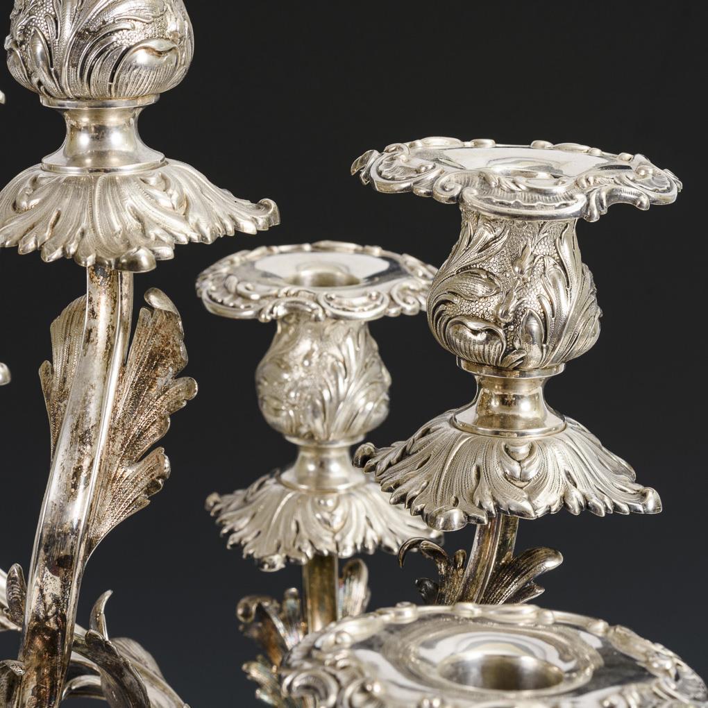 Großer 7-flammiger Leuchter mit floral reliefiertem Schaft und Rundfuß sowie schwungvoll gewundenen Blattarmen mit floralen Tüllen, Tropfteller abnehmbar.