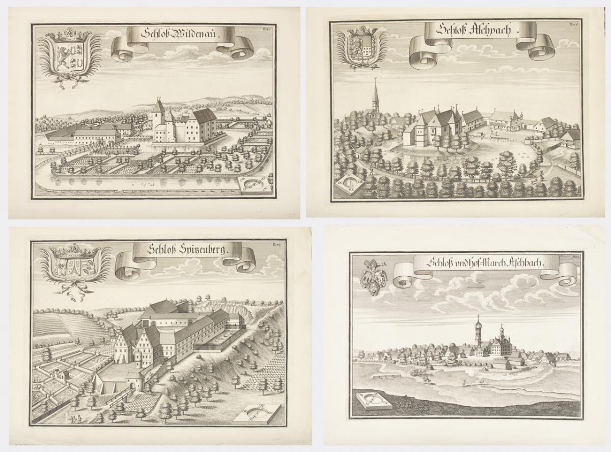 "Schloß Wildenau", Platte: 26 x 36 cm, Blatt: 30,5 x 42 cm | "Schloß Aschpach", Platte: 26,5 x 36 cm, Blatt: 30 x 41,5 cm | "Schloß Spitzenberg", Platte: 26,5 x 36,3 cm, Blatt: 30 x 41 cm | "Schloß und Hof=Marsch Aschbach", Platte: 26,5 x 36,3 cm, Blatt: 34,5 x 43 cm; aus: "Historico Topographica Descriptio", 1701 - 1726. Je griff- und knickspurig.