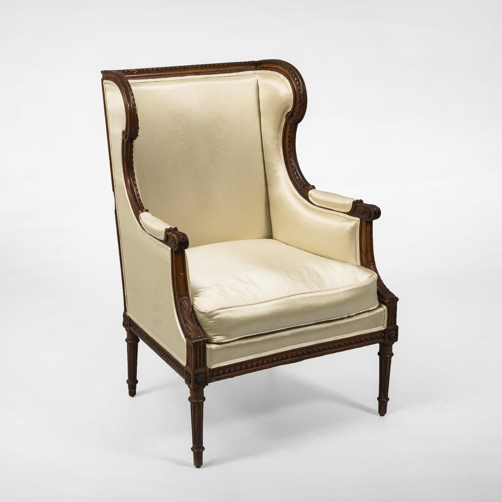 Voll gepolsterter Armlehnsessel in typischer Ohrenbackenform mit antikisierendem Schnitzdekor aus Kanneluren, Perlstab und Rosetten; champagnerfarbener Satinbezug. Teils Anobienbefall, Alters-/Gebrauchsspuren, Polster und Bezug ergänzt, linker hinterer Fuß mit Defekten.