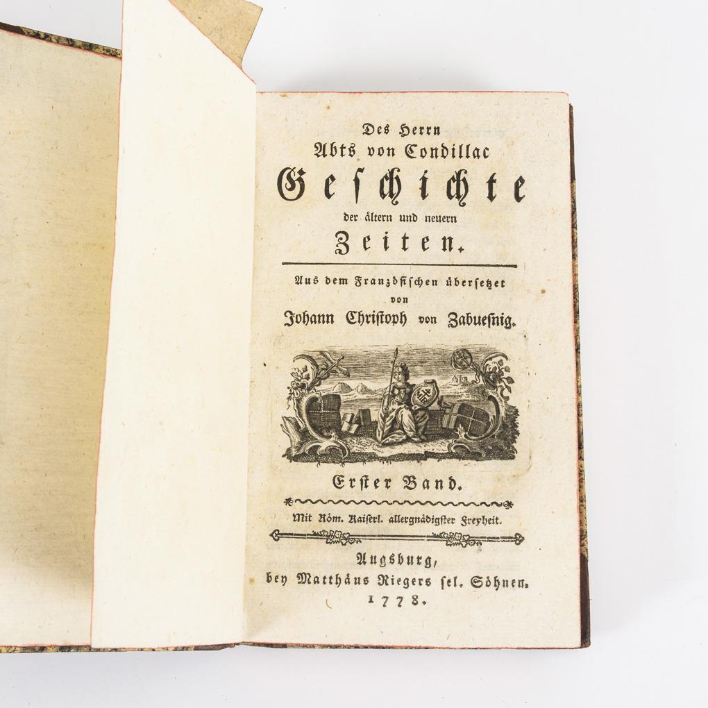 17 Bücher in 10 Bänden (Band 1-10), es sind vermutlich noch mehr Bände erschienen. Aus dem Französischen übersetzt von Johann Christoph von Zabuesnig. Das Geschichtswerk beginnt mit der Sintflut und Band 10 mit den europäischen Mächten zu Beginn des 18. Jahrhunderts. Halbledereinband der Zeit und Rotschnitt. Band 1 mit kleiner äußerer Fraßspur, sonst gute Erhaltung.