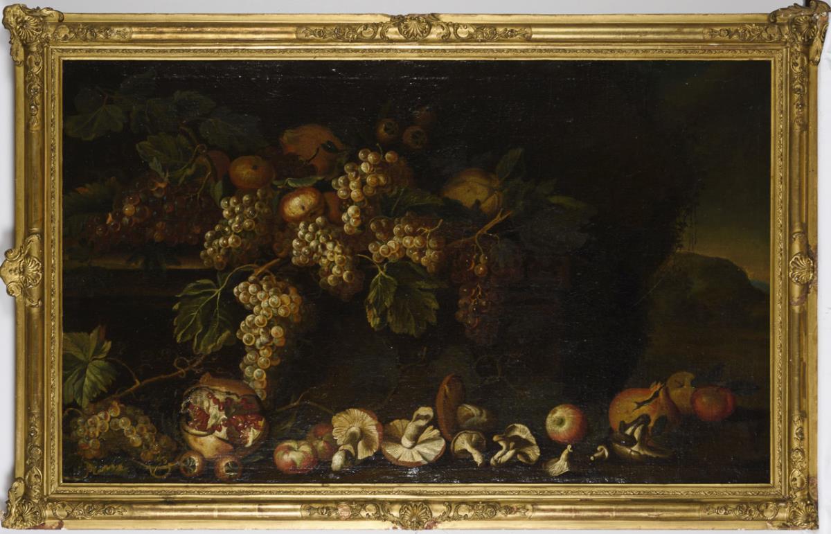 Großes Stillleben mit arrangierten Früchten wie Weintrauben, Pfirsichen, Granatäpfeln und Pilzen, in einer Parklandschaft. Leinwand doubliert.