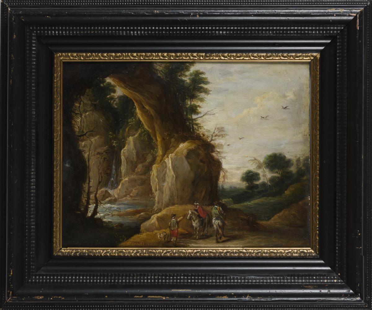 Reiter im Gespräch mit Wanderer an einem Felsbogen mit Wasserfall. Farbabsplitterung.