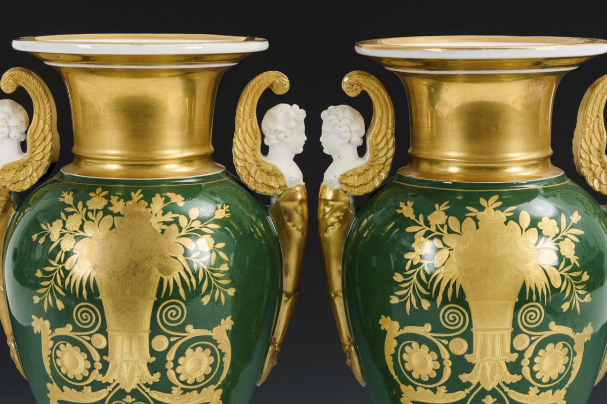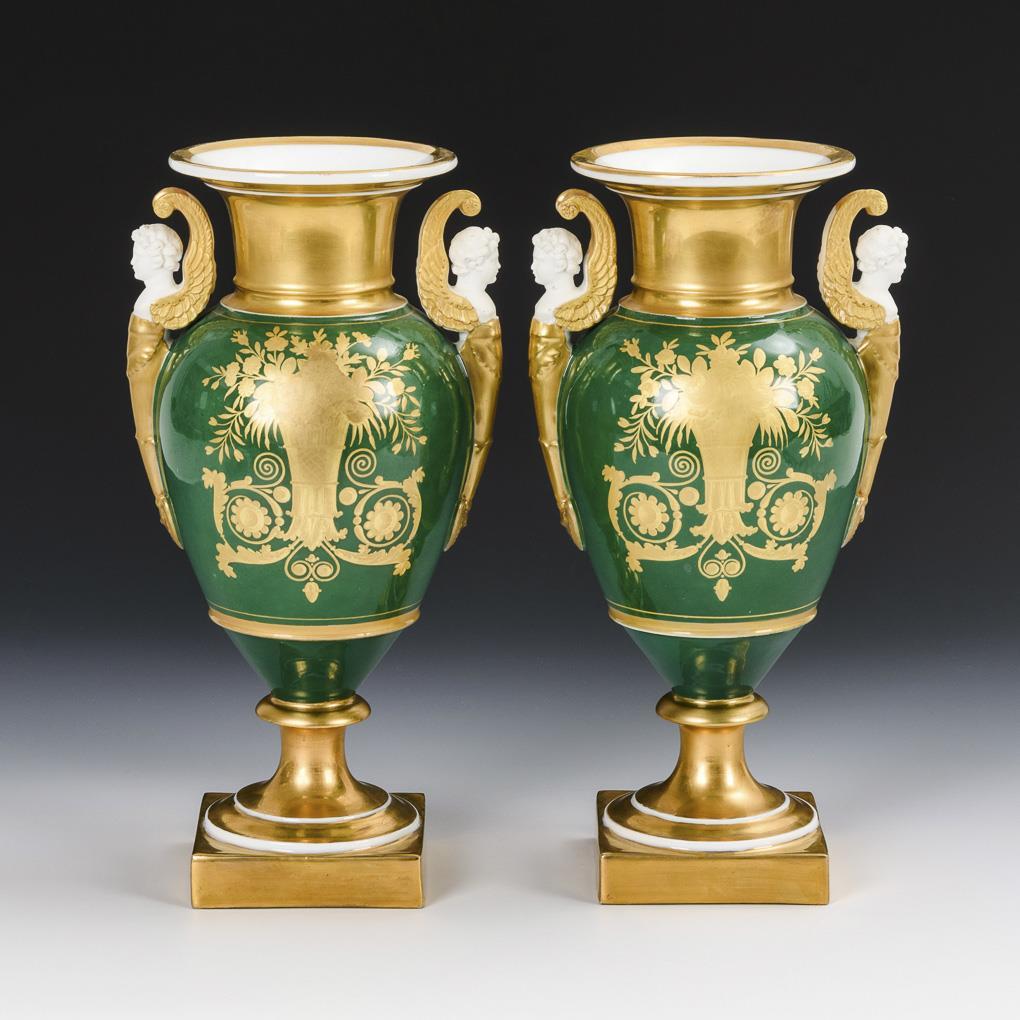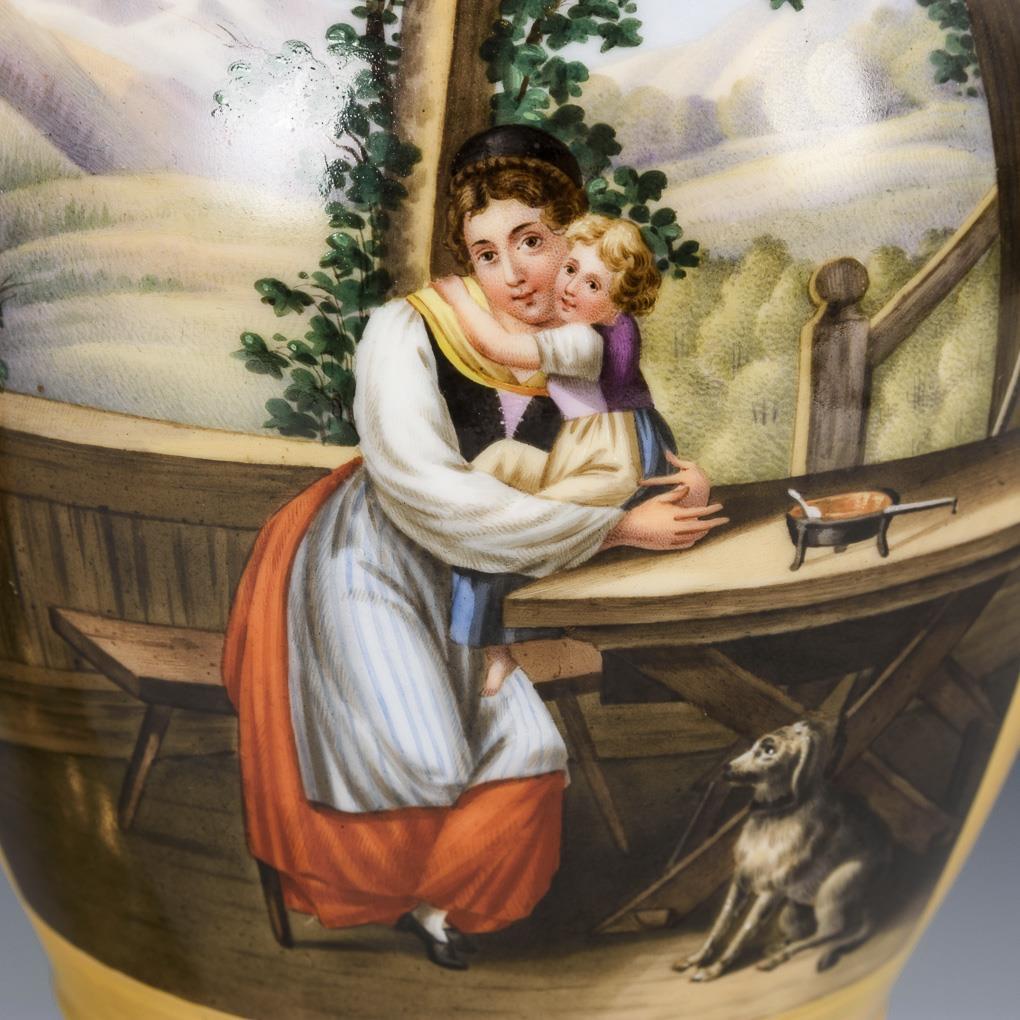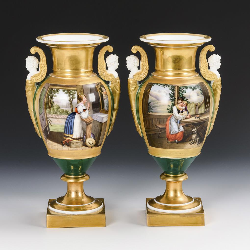 Ovoide Vasen mit Kraterhals, zwei Engelskopfhandhaben und Rundfuß, auf Quadrathplinthe. Schauseitig eine Rechteckkartusche mit den fein gemalten Darstellungen einer an einem Tisch sitzenden Mutter mit ihrer Tochter, bezeichnet "Muttertreue" bzw. einer jungen, vor einer Madonna betenden Frau, bezeichnet "Andacht". Bei beiden Korpusansatz und Wandung verso restauriert, 1x Handhaben restauriert.