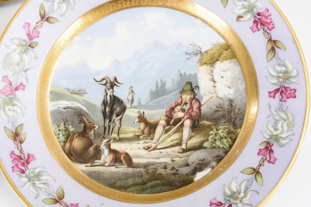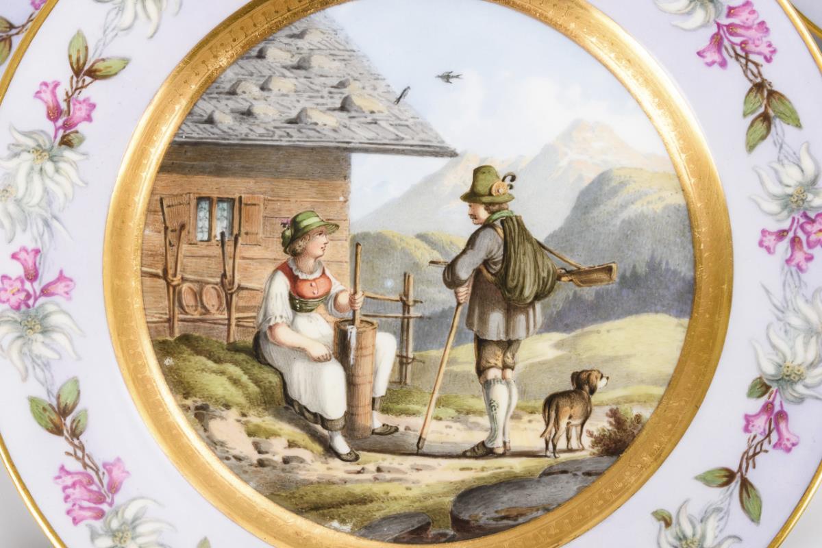 Flache Teller mit einem Blumenband mit Edelweiß auf dem violetten Fahnenfond, im Spiegel alpine Motive mit Figuren. Partiell minimaler Farb- bzw. Goldabrieb.
