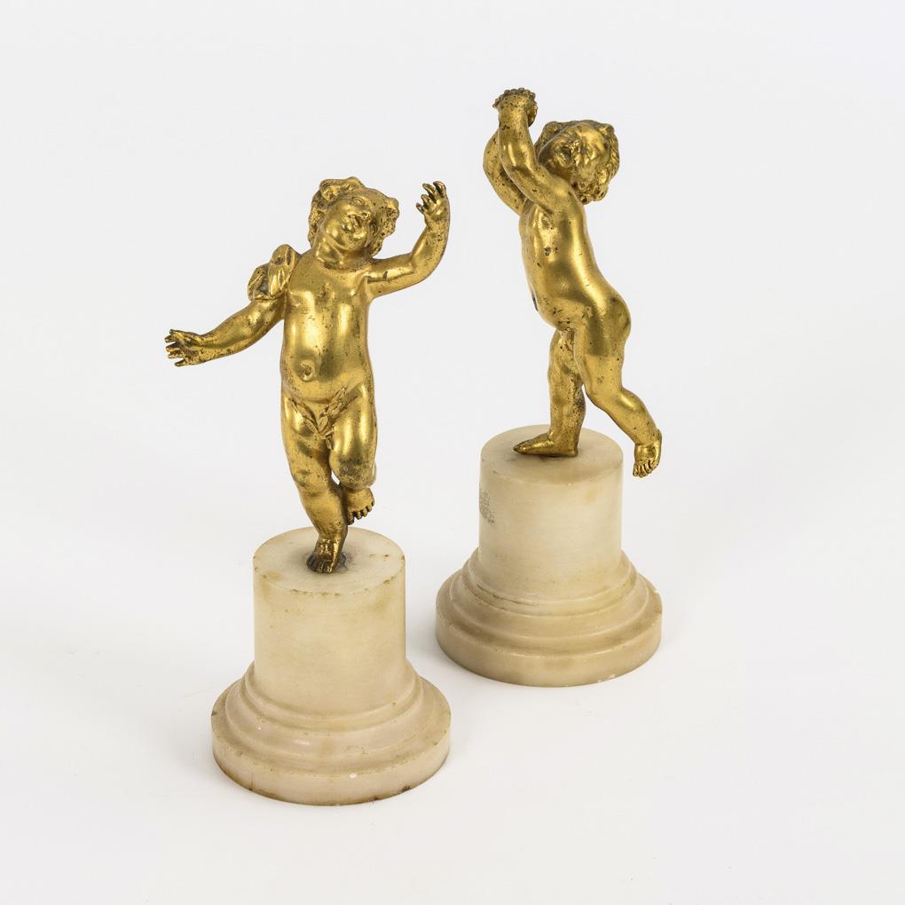 Bronze vergoldet, weiße Marmor-Postamente. Wohl 18. Jh. H je 11,5 / 18 cm.