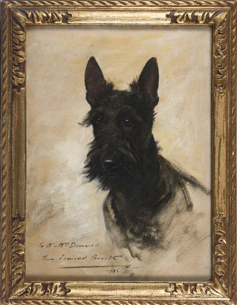 Bildnis des schwarzen Hundes vor hellem Hintergrund.