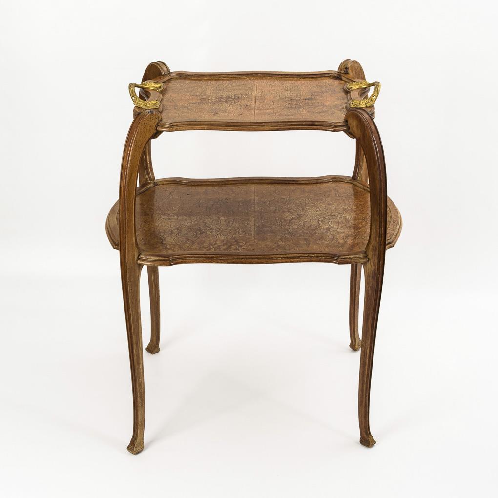 2-etagiges Tischchen mit verschieden großen, geschweiften Ablageflächen und 2 stiltypischen Bronze-Griffen. Auf 4 gebogten und spitz zulaufenden Profilbeinen. Leichte Alters-/Gebrauchsspuren, ergänzte Winkel.