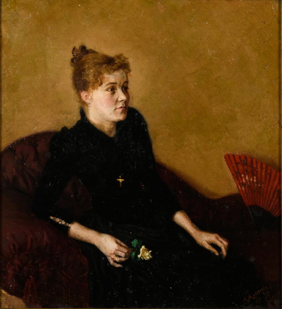 Porträt einer Frau im schwarzen Kleid mit goldenem Kreuzanhänger. Minimale Altersspuren.