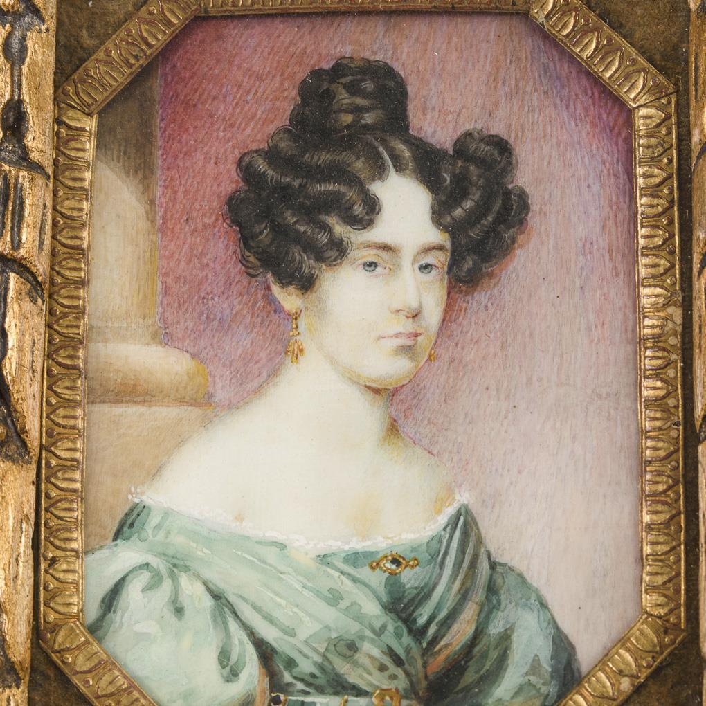 Miniatur: Damenbildnis im Goldstuckrahmen.