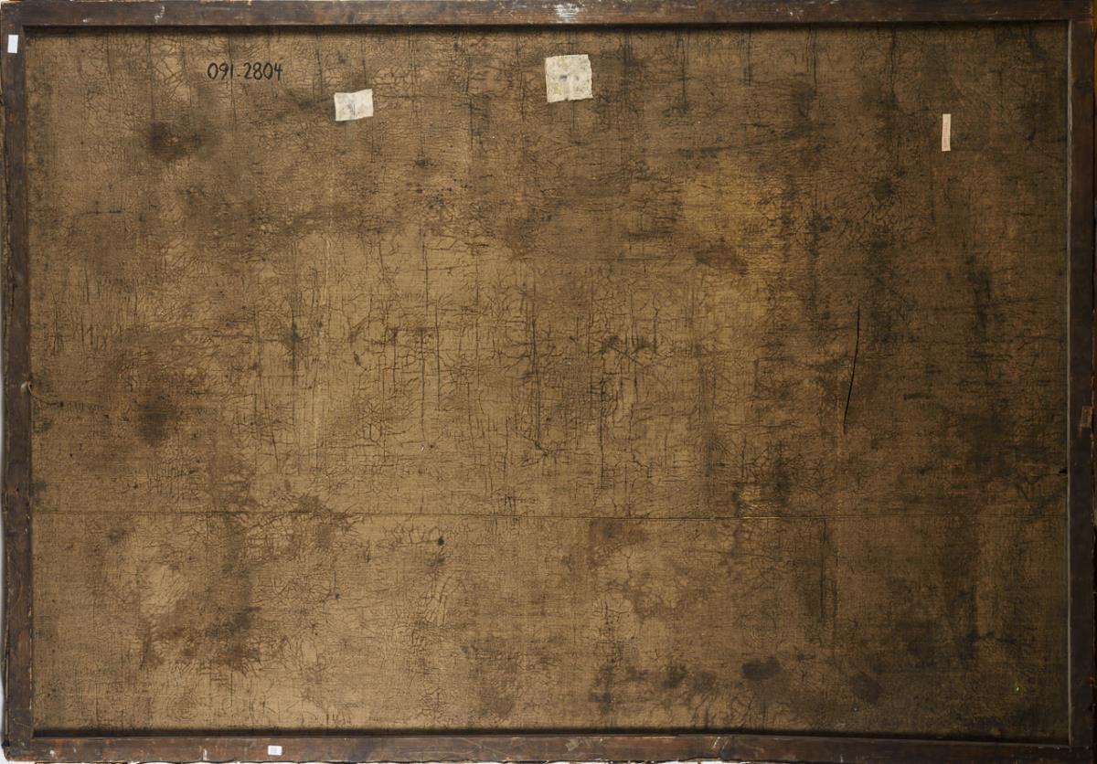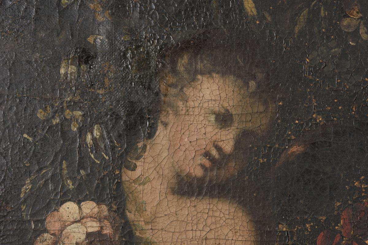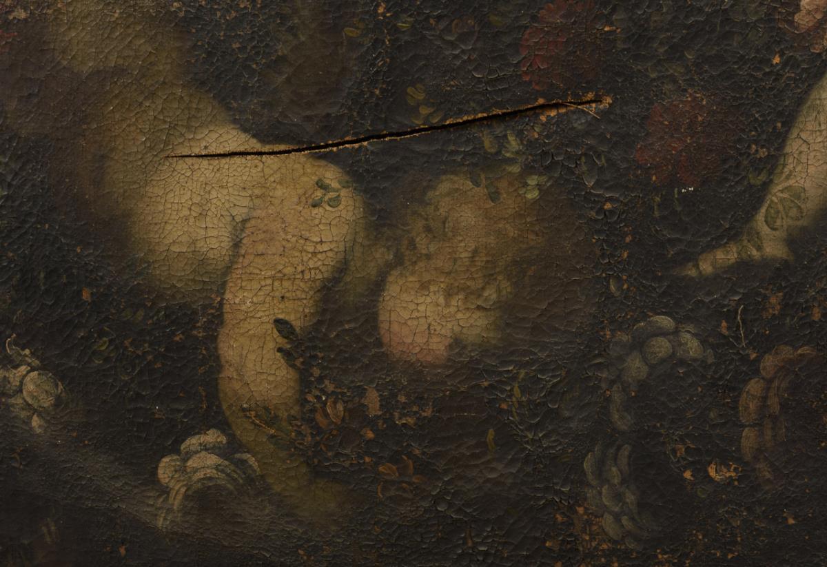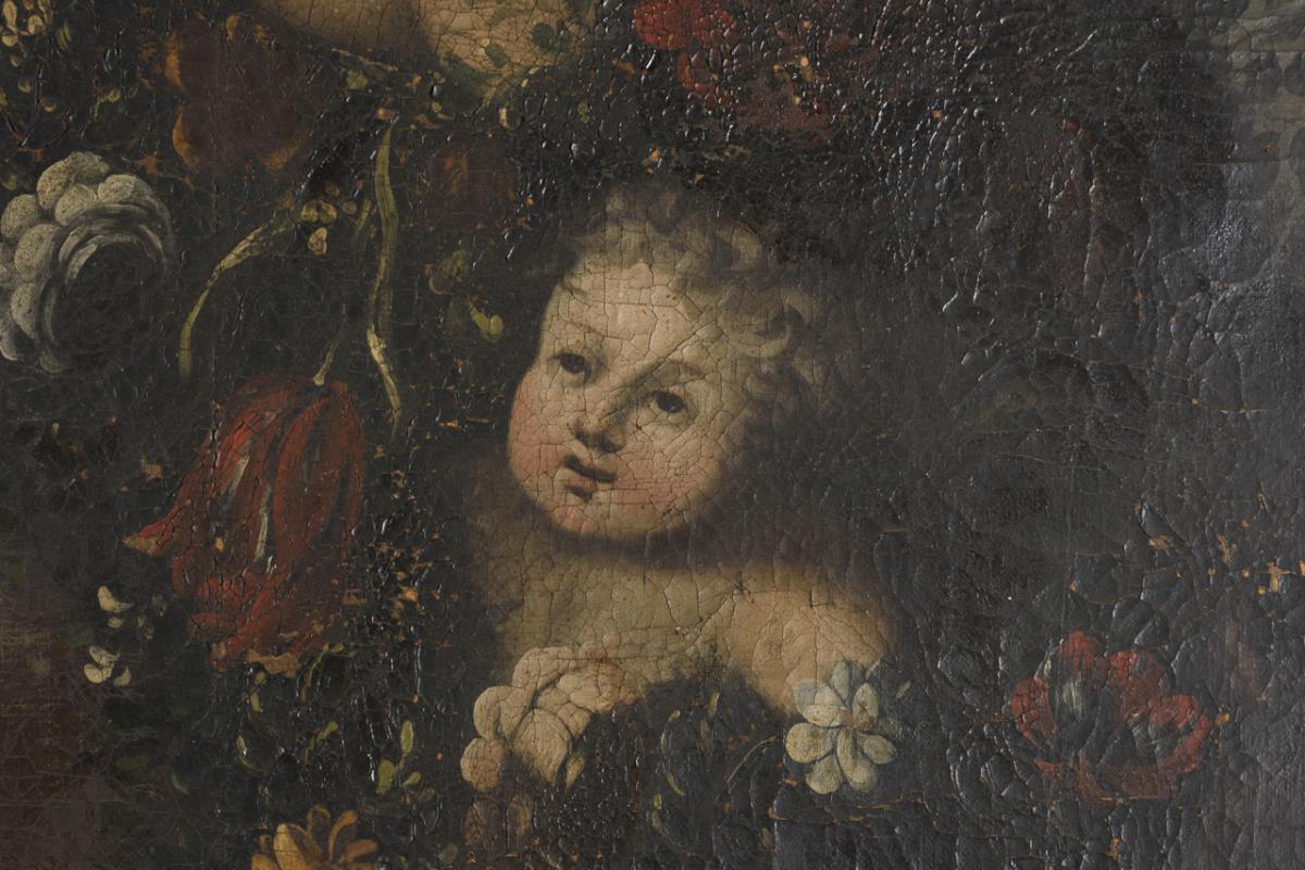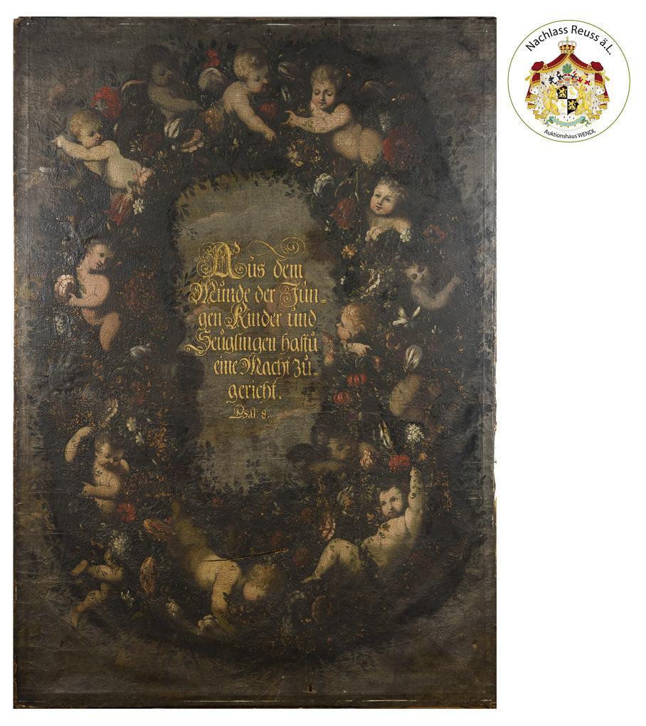 Sehr großes Gemälde mit zahlreichen Putten am Blumenkranz. Restaurierungsbedürftig.