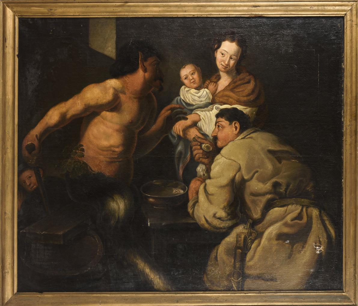 Gute Kopie nach dem barocken Original, welches heute in der Gemäldegalerie Berlin zu sehen ist. Defekte.