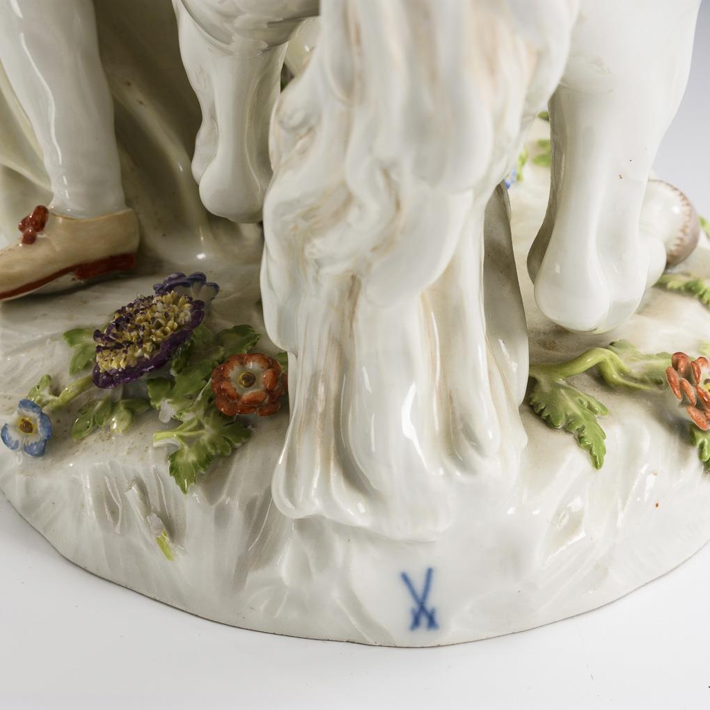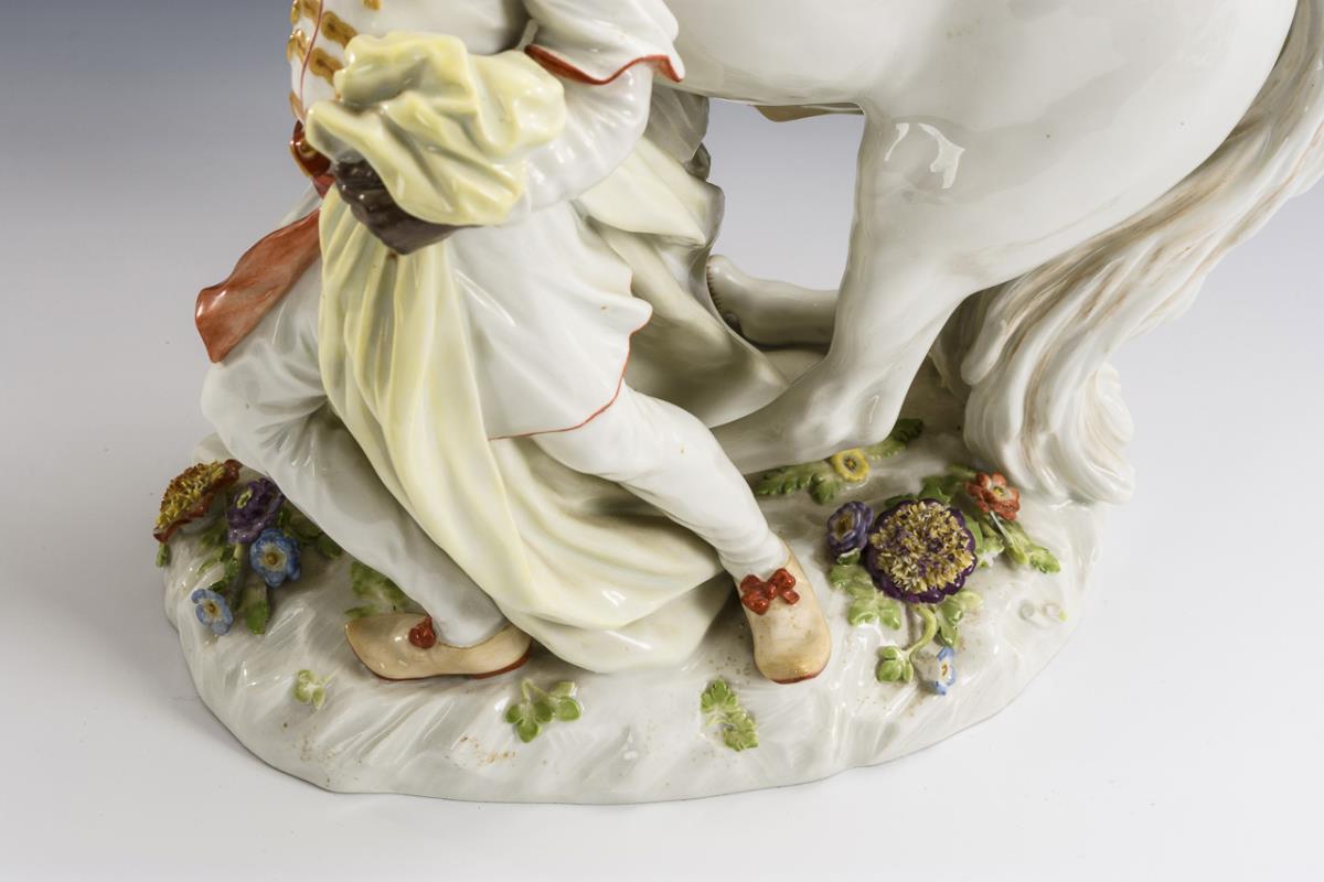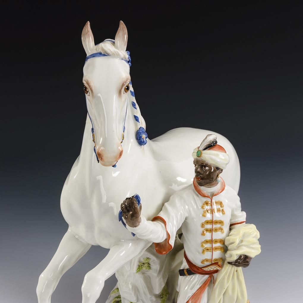 Auf einem blütenbelegten Sockel stehender, orientalisch gekleideter Afrikaner, ein die Lektion der Levade ausführendes Pferd am Zügel führend. Zügel defekt, 3 Blätter bestoßen.