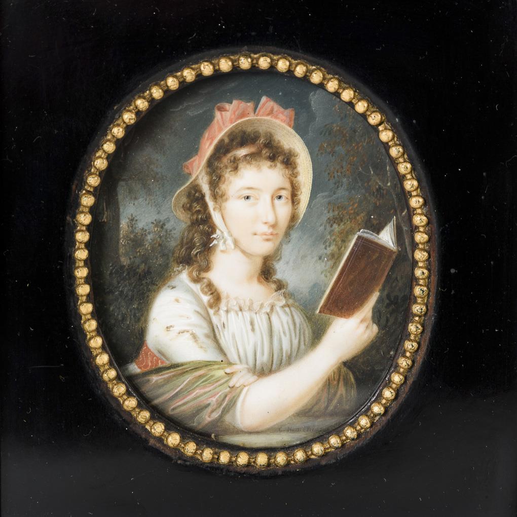 Sehr detailliert gemalte junge Frau im hellen Licht, die von ihrer Lektüre in der Hand aufblickt; im Hintergrund ein angedeuteter Wald.