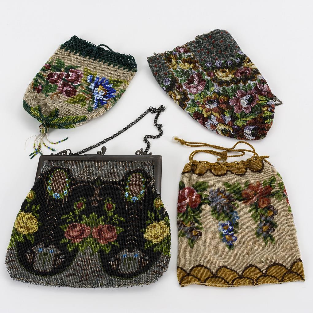 Je vollständig mit floralem Ornamentdekor bestickt/gestrickt. Bügeltasche mit Kette, 2 gestickte Perlbeutel (1x mit Kettenzug) sowie 1 gestrickter Rechteck-Perlbeutel. Einige zumeist kleine Löcher im gestrickten Beutel, an der Tasche 1 Scharnier defekt und geringe Perlen-Fehlstellen, 1 Pampel fehlt.