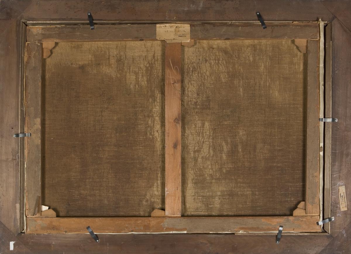 Seltenes Arrangement mit Gemälden, ostasiatischer Keramik, drapiertem Tuch und Kommode. Rückseitig auf altem Klebezettel bezeichnet. Originaler Keilrahmen, profilierter Silberrahmen mit weiß gefasster Leiste.