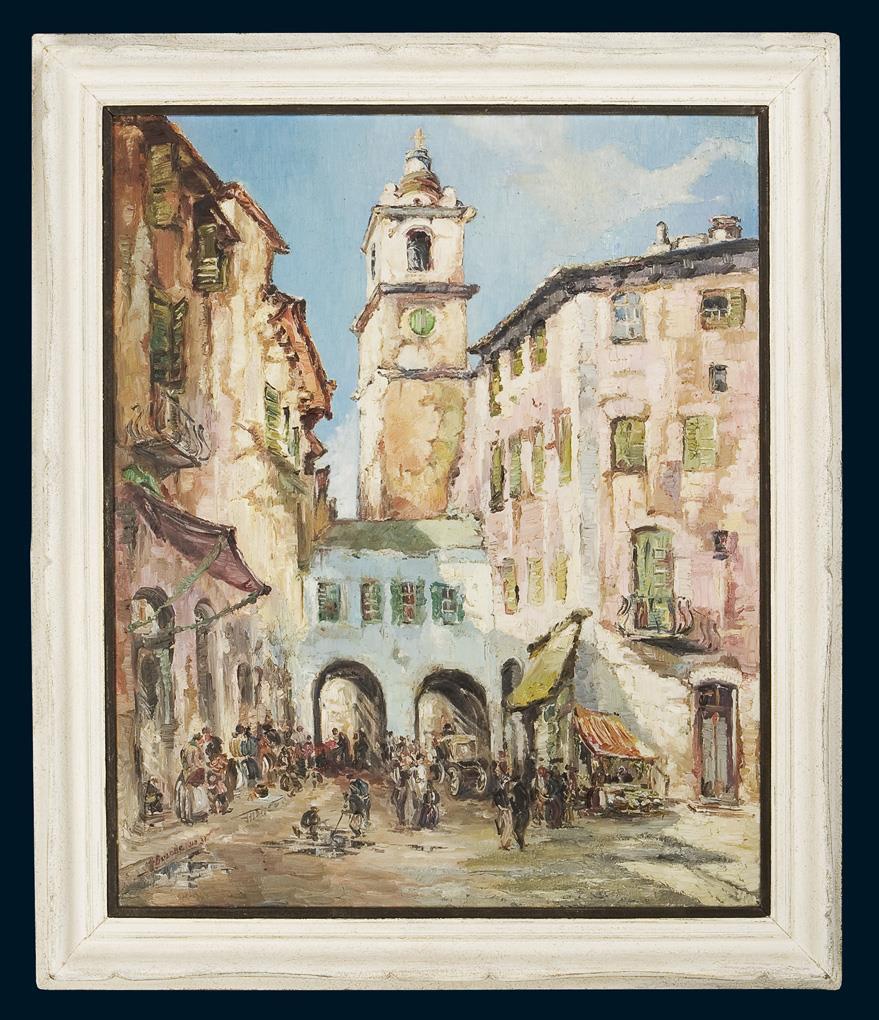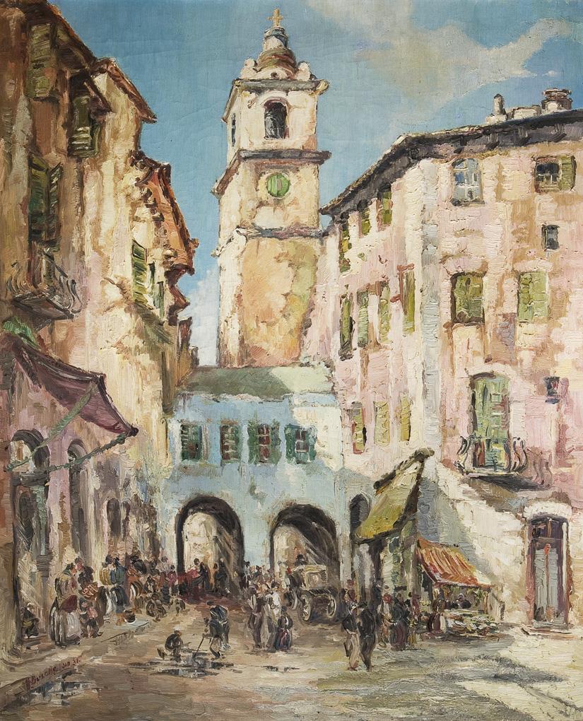 Altstadtansicht mit reicher Figurenstaffage im hellen Sonnenlicht. Weiß gefasster Profilrahmen. Am unteren Rand zwei Flicken.