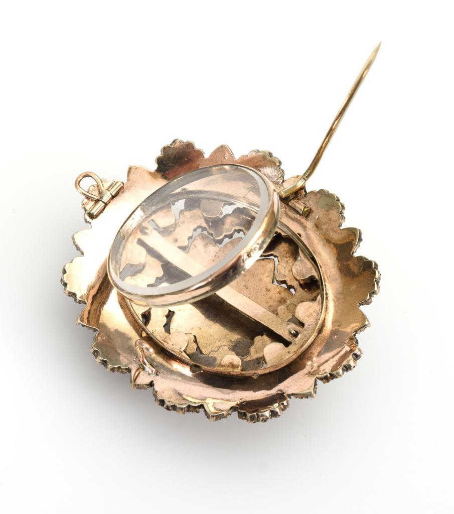 4-ebnig granatbesetztes Medaillon. Verglast gerahmte Rückseite, Hakenverschluss und Scharnieröse.