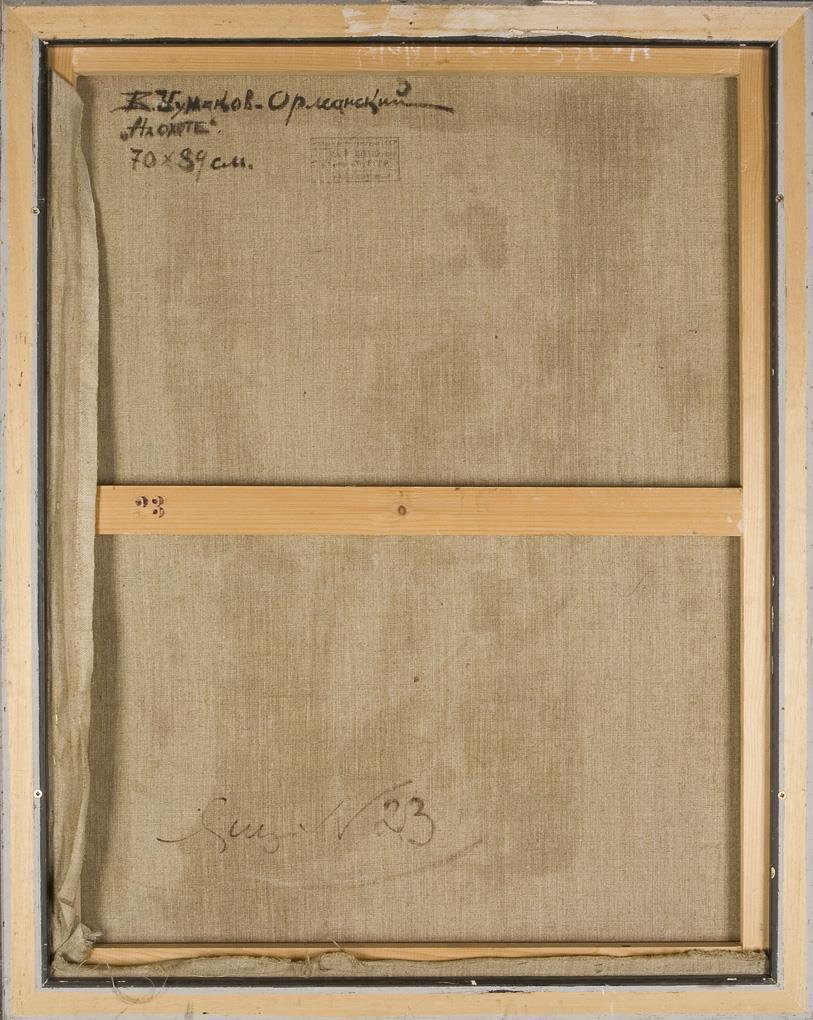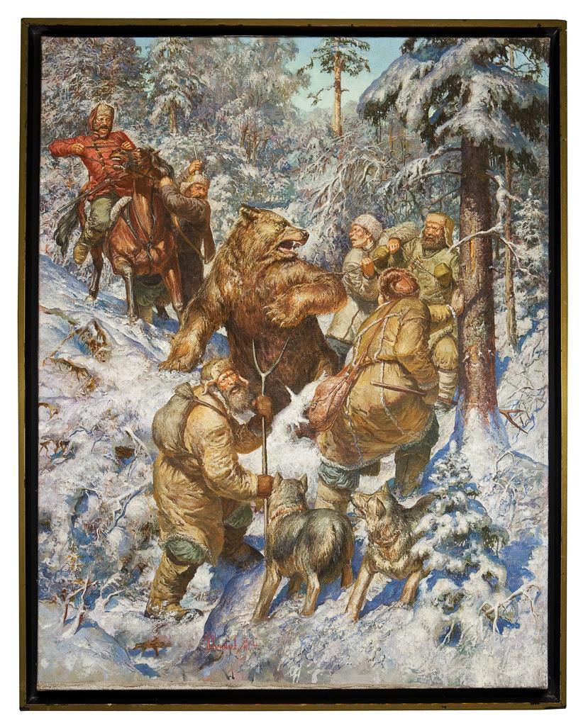 Eine figurenreiche, fein und detailreich gemalte Genreszene. Rückseitig kyrillisch bezeichnet, kyrillischer Stempel. Schwarz-gold gefasster Rahmen.