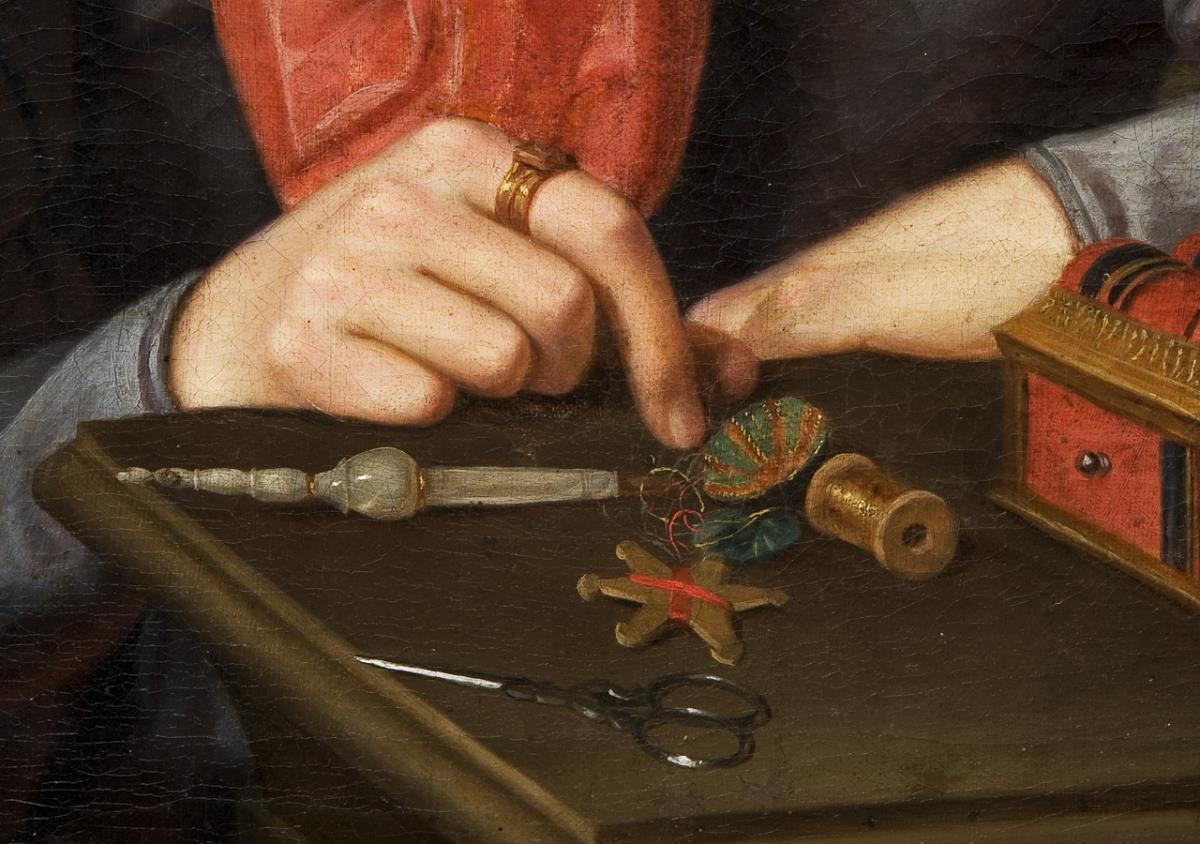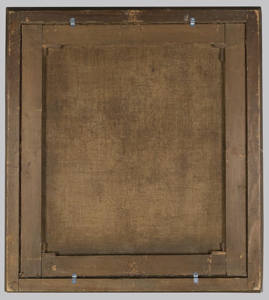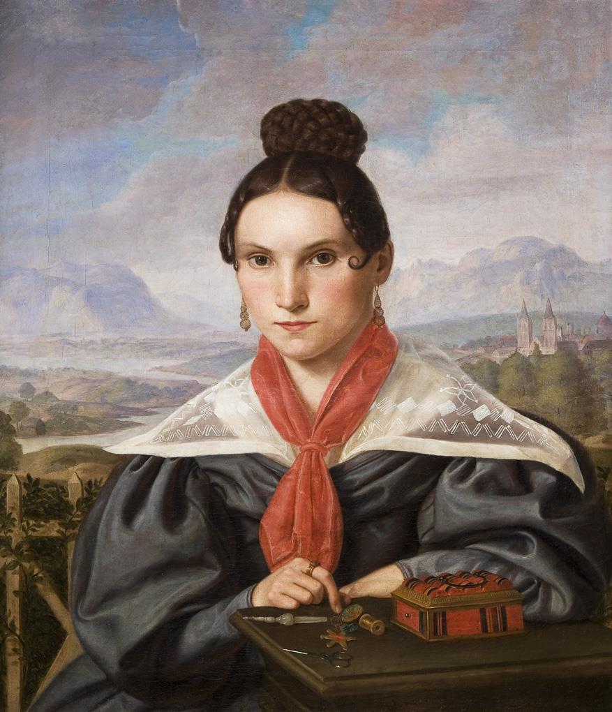 Bürgerlich schlicht präsentiert sich die junge Dame in Kleidung und Frisur dem Zeitgeschmack entsprechend. Ein Charakterporträt mit klaren Formen, der dezente Landschaftshintergrund mit fließenden Konturen zeigt die Umgebung der Porträtierten. Originaler Keilrahmen, originaler vergoldeter Stuckrahmen.