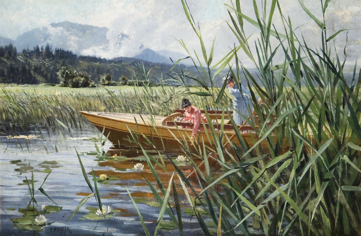 Impressionistisch angelegte Sommeransicht. Eine überlegt ausgeführte Kompostion, eingerahmt von Bergen und Schilf. Mit malerischer Finesse sind der Wechsel von Licht- und Schattenzonen und die beiden Damen in anmutiger Versunkenheit dargestellt. Signiert: H. Neuber. Originaler Keilrahmen, profilierter Goldrahmen.