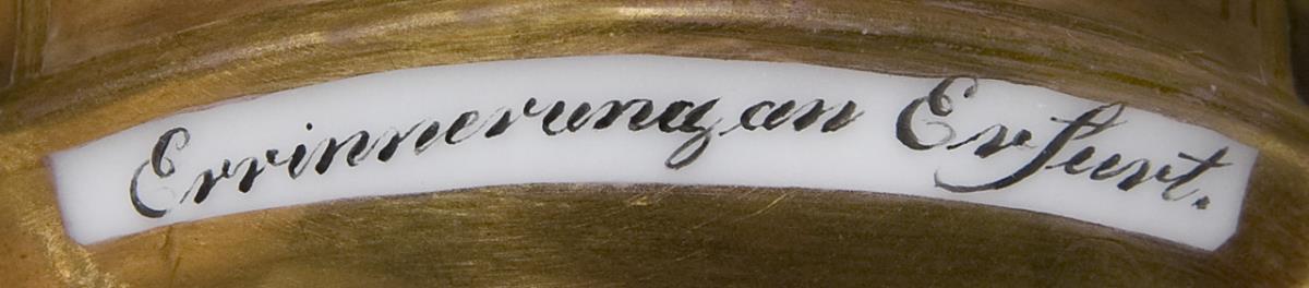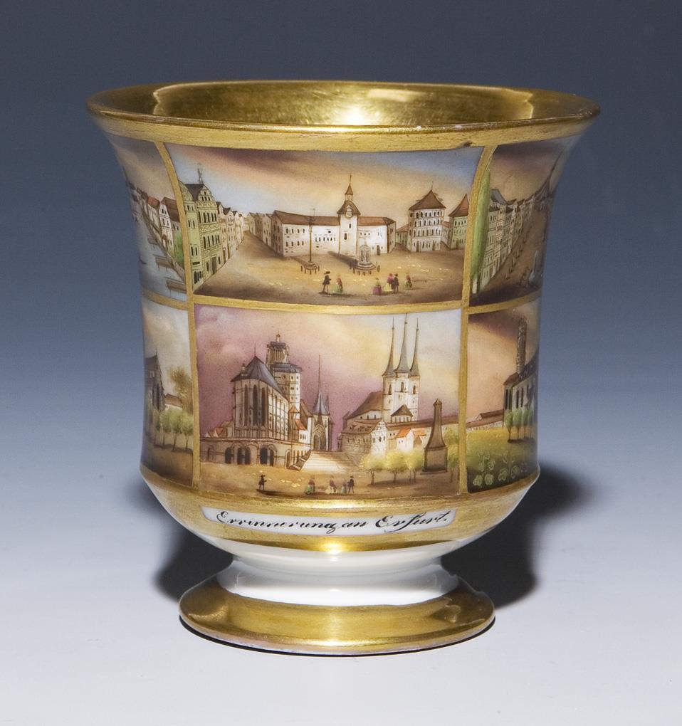Nymphenburger Form-Modell. Umlaufend feine farbige Bemalung mit 10 verschiedenen Ansichten "Erinnerung an Erfurt". Goldstaffage. Ohne Marken. Untertasse ergänzt.