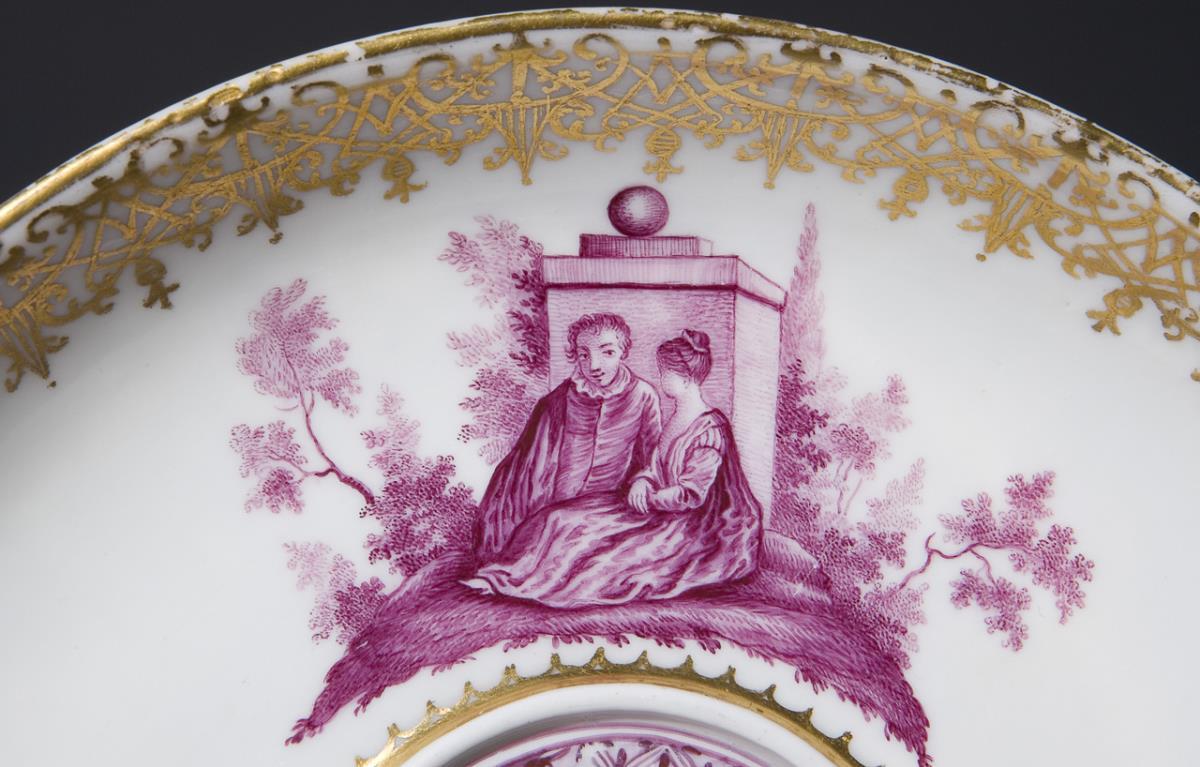 Allseits reiche feine Camaieu-Malerei in Purpur mit neun verschiedenen Szenen nach Jean Antoine Watteau (1684-1721). Im Spiegel Purpur-Mosaik. Goldspitzenbordüren, Goldstaffage. Die vier Szenen auf dem Deckel sind auf feinen Goldspitzen-Konsolen gemalt, die durch Purpur-Ranken verbunden sind. Schwertermarken, goldene Malermarken. Henkel restauriert.