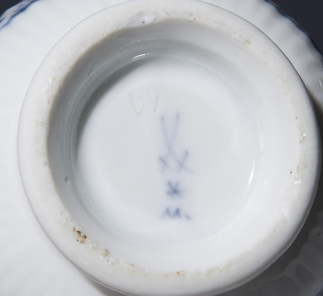 Kobaltblaue Unterglasurmalerei, "Strohblumendekor". Reliefdekor "Gebrochener Stab". Blaue Malermarken, Schwertermarken mit Stern. Ausguss, ein Standring von innen leicht bestoßen.