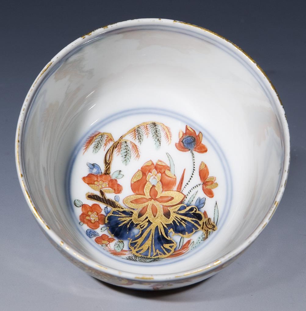 Umlaufend und im Spiegel kobaltblaue Unterglasurmalerei, farbige Aufglasurmalerei, Goldmalerei. "Brokatdekor im Imari-Stil". Blaue Malermarke K, Johann David Kretzschmar zugeschrieben (1697-1765, 1726-1752 Blaumaler in Meissen), Schwertermarke.