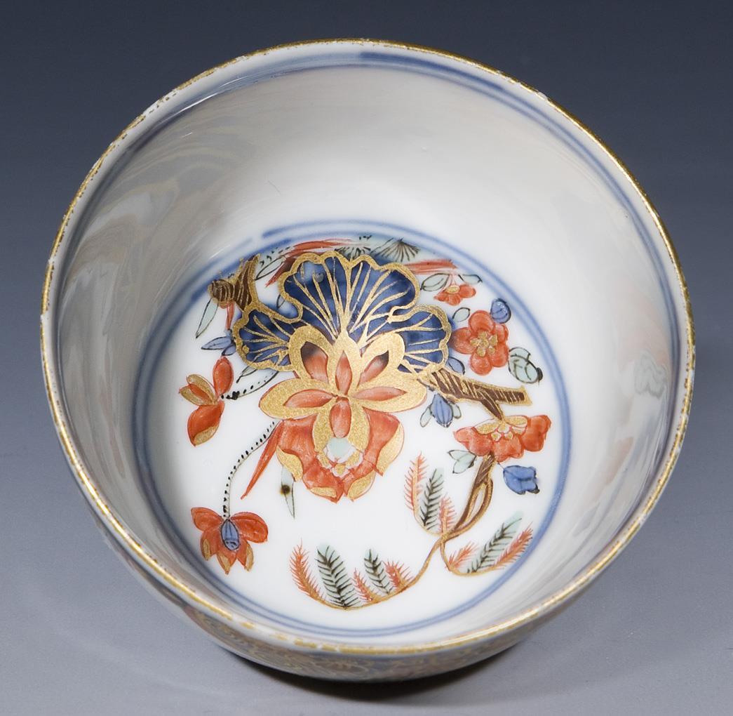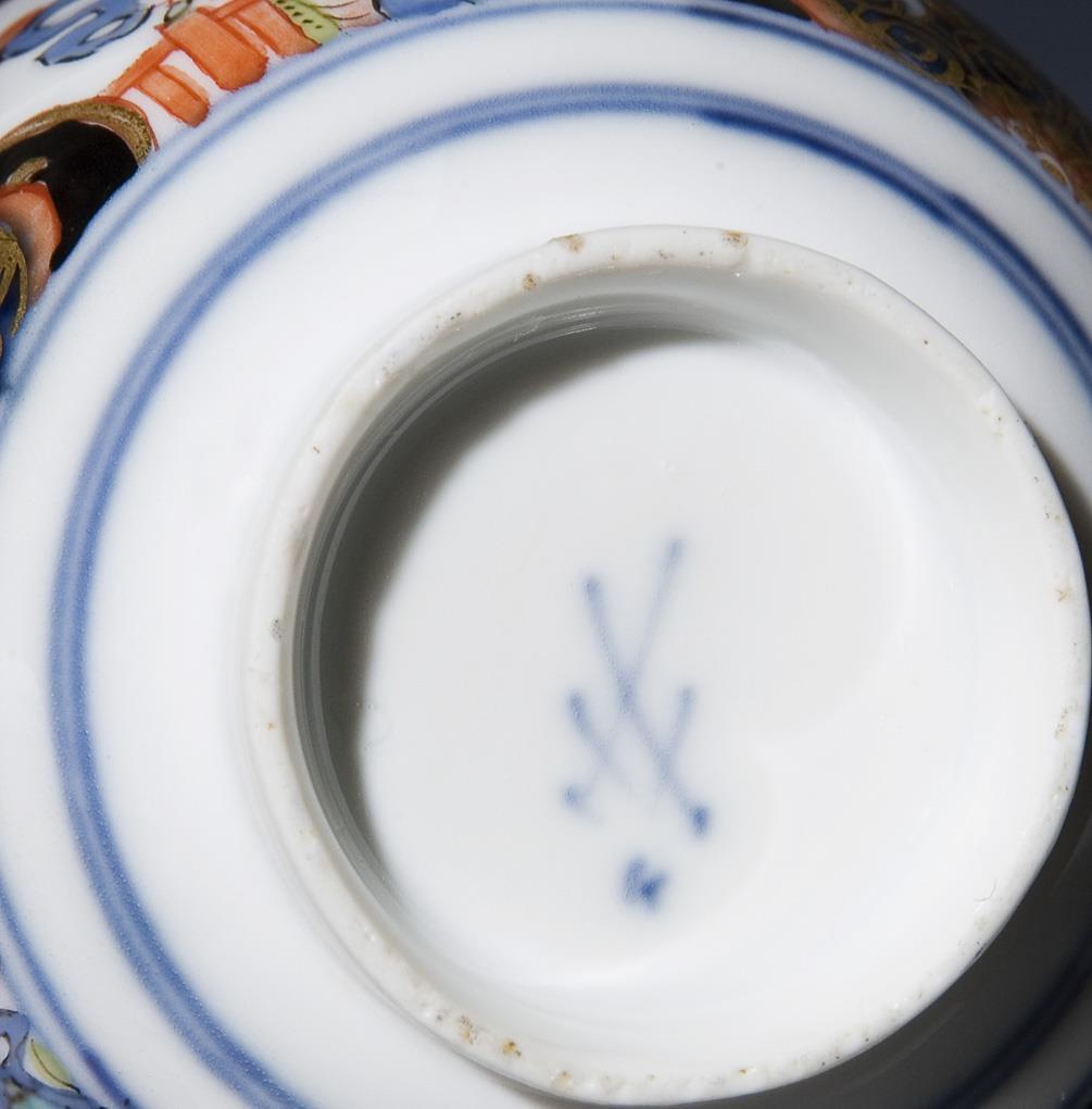 Umlaufend und im Spiegel kobaltblaue Unterglasurmalerei, farbige Aufglasurmalerei, Goldmalerei. "Brokatdekor im Imari-Stil". Blaue Malermarke K, Johann David Kretzschmar zugeschrieben (1697-1765, 1726-1752 Blaumaler in Meissen), Schwertermarke.