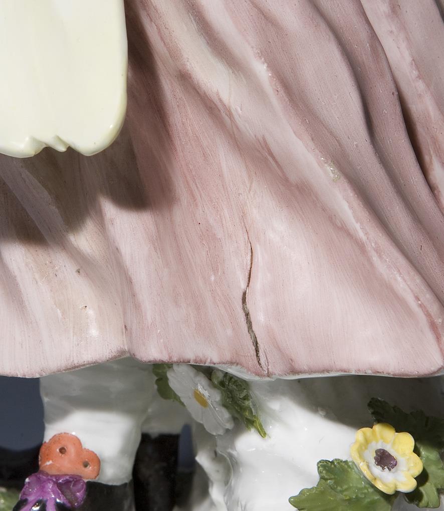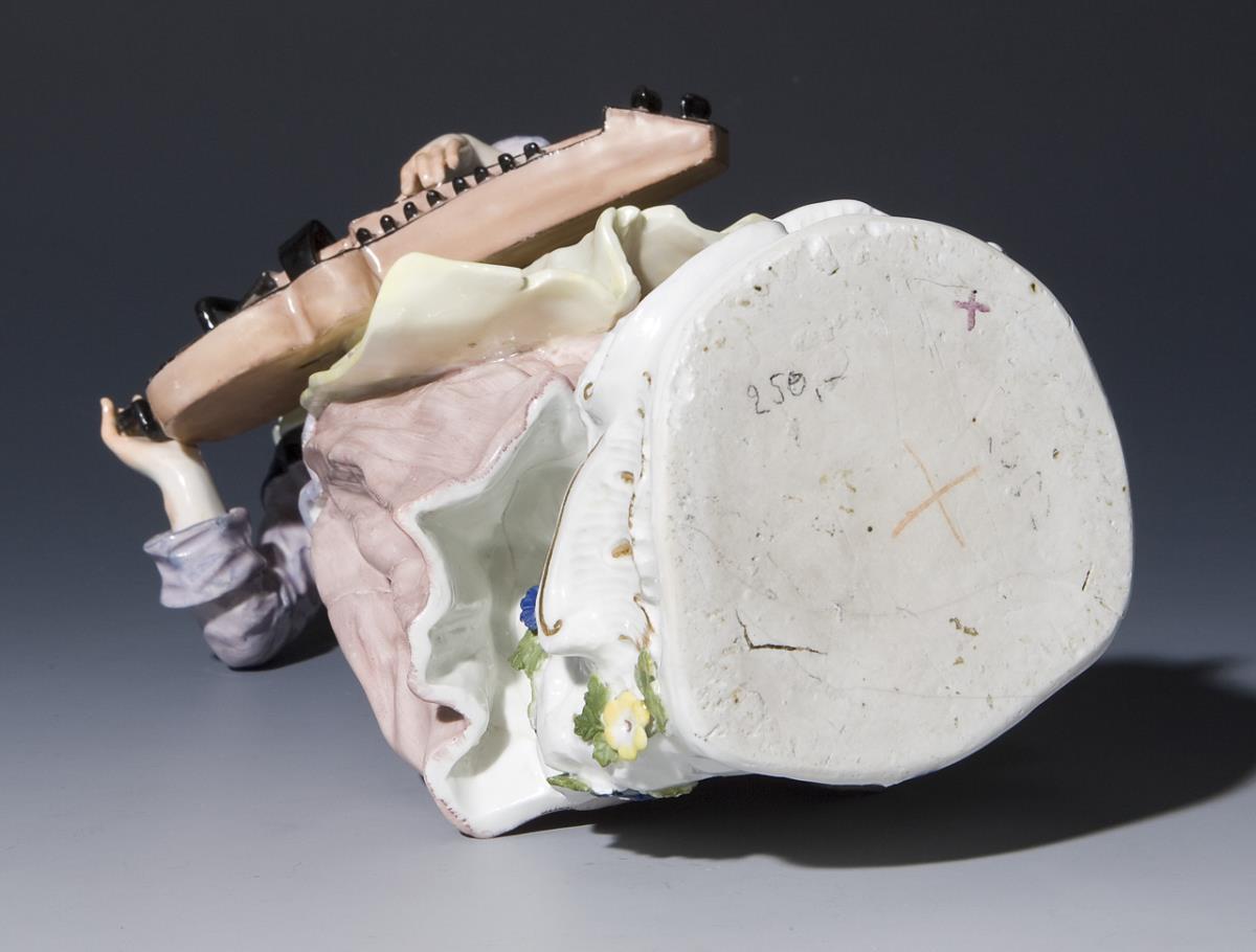 Modell von Johann Joachim Kaendler 1750. Farbig bemalt, gold staffiert. Unglasierter Boden, Schwertermarke am Sockel. Partiell kleine Brandrisse, Haarrisse, Drehleier minimal, Hände, Blüten restauriert.