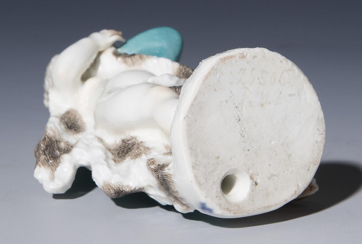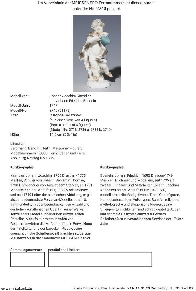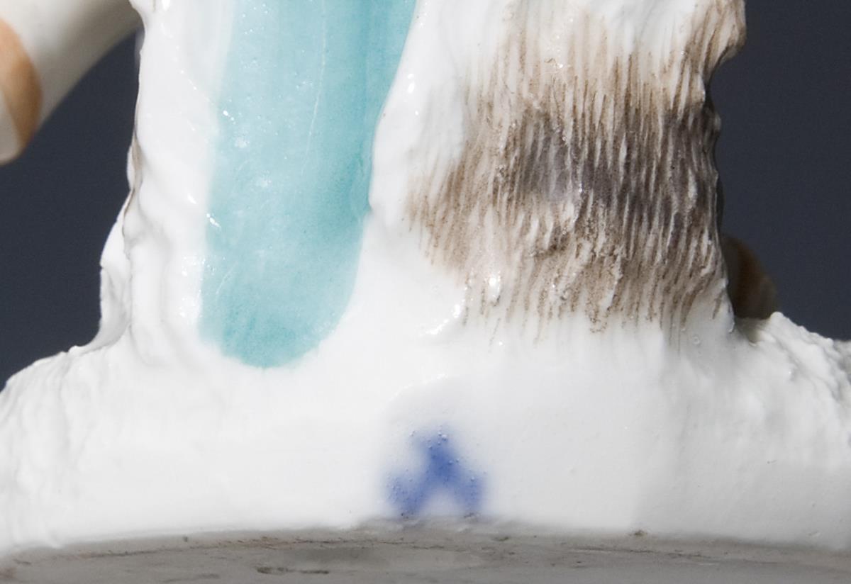 Modell von Johann Joachim Kaendler und Johann Friedrich Eberlein 1747. Farbig bemalt. Unglasierter Boden, Schwertermarke am Sockel. Kufen, zwei Finger bestoßen.