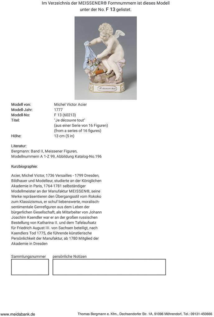 Acier, Bildhauer und Modelleur, studierte an der Akademie in Paris, 1764-1781 selbständiger Modellmeister in Meissen. Meissen-Manufaktur-Preis: 2490,- Euro * Partnerauktion Bergmann.