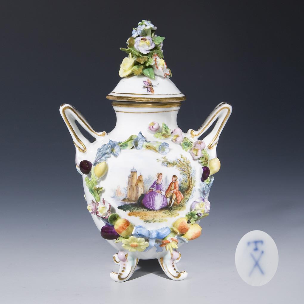Beidseits plastisch aufgelegte Blüten und Früchte. Auf dem Deckel plastisches Blumenbukett. Farbig bemalt, gold staffiert. Frontal Rokoko-Paar in Landschaft. Auf dem Deckel rückseitig und seitlich Blüten und Insekten. Bodenmarke. Belege partiell bestoßen.