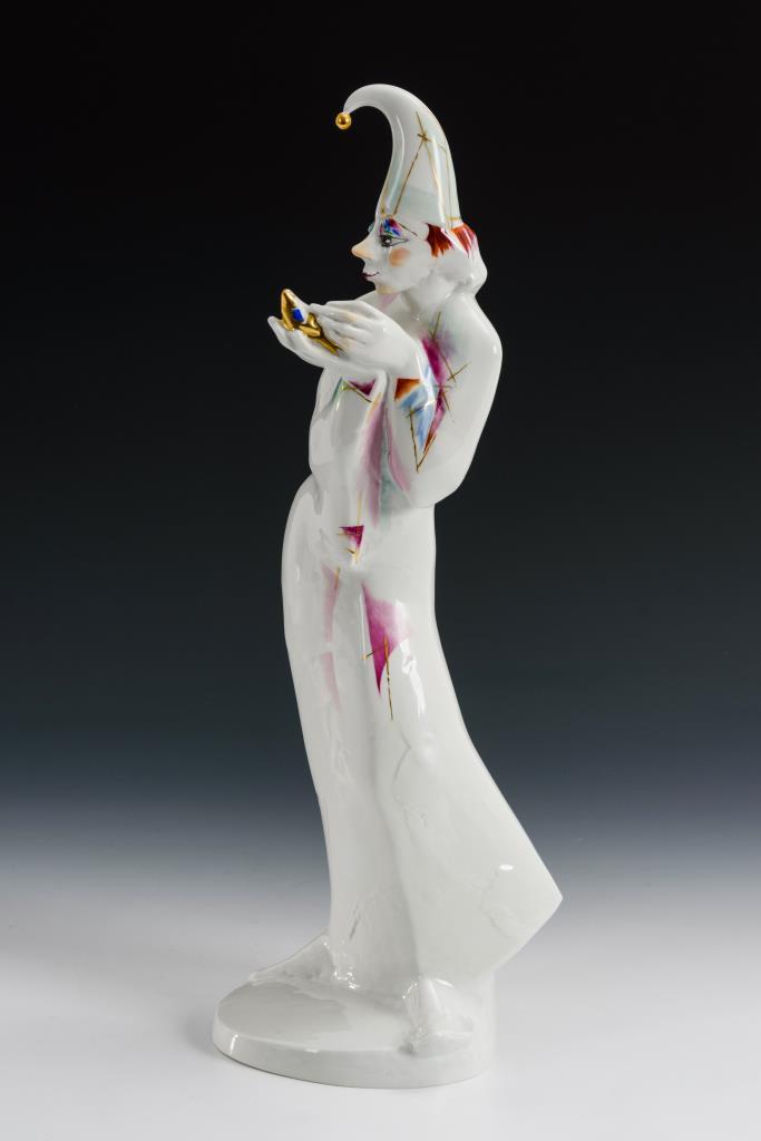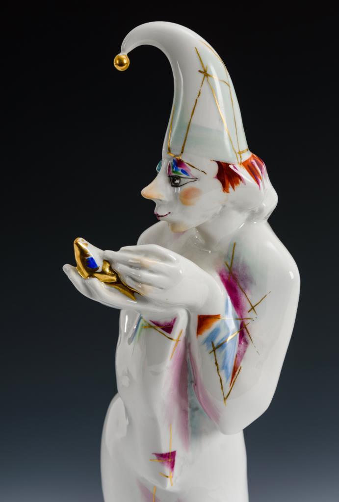 Ausdrucksvoll gestalteter Harlekin, ein goldenes Vögelchen in seiner Hand streichelnd.