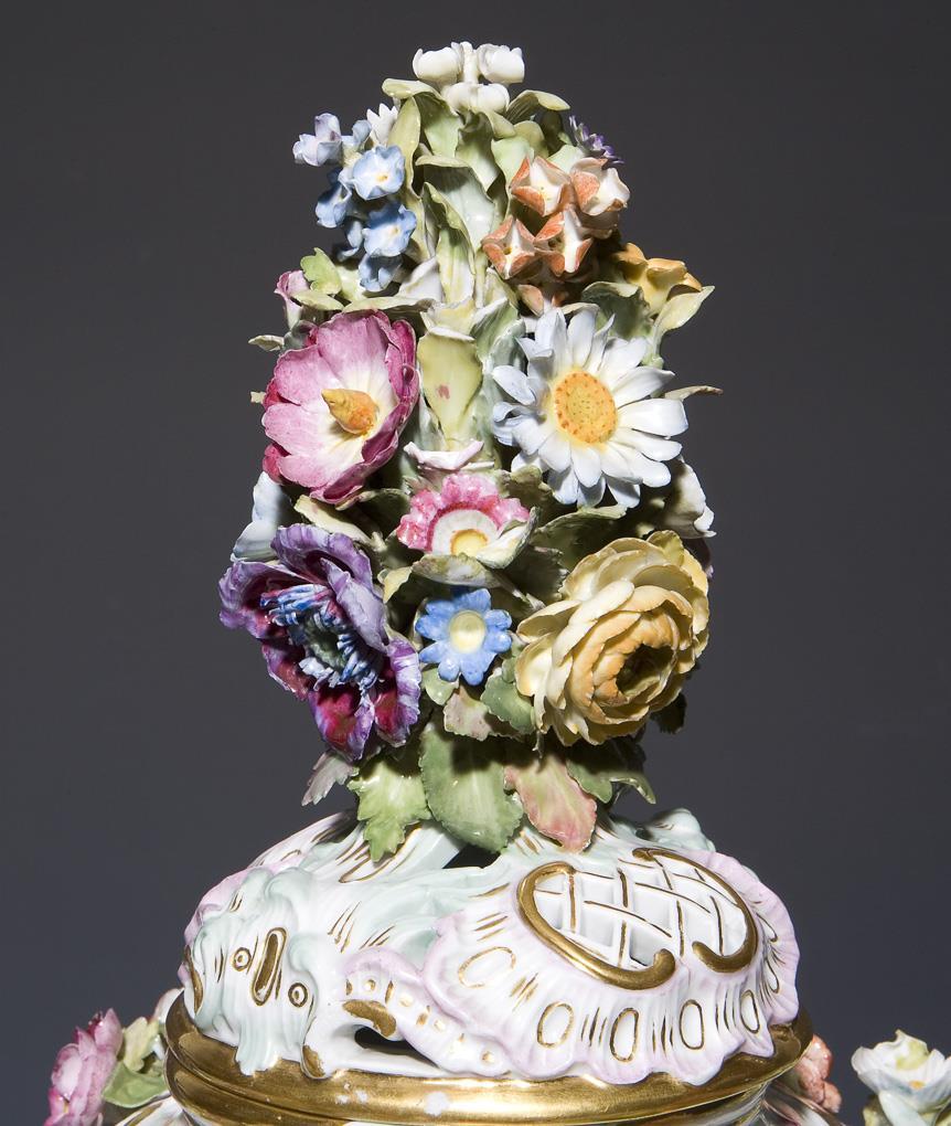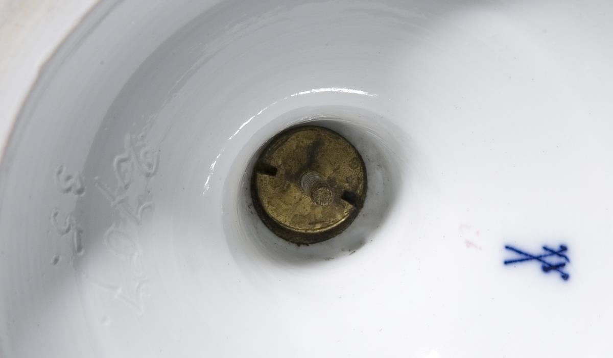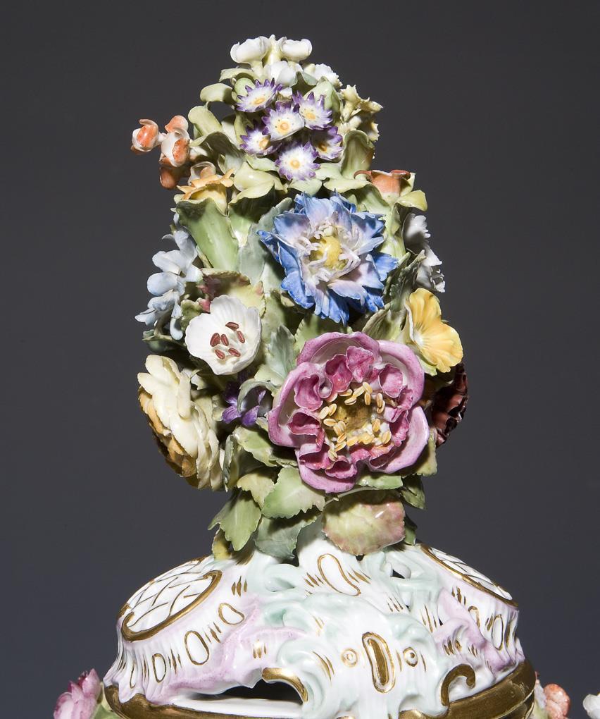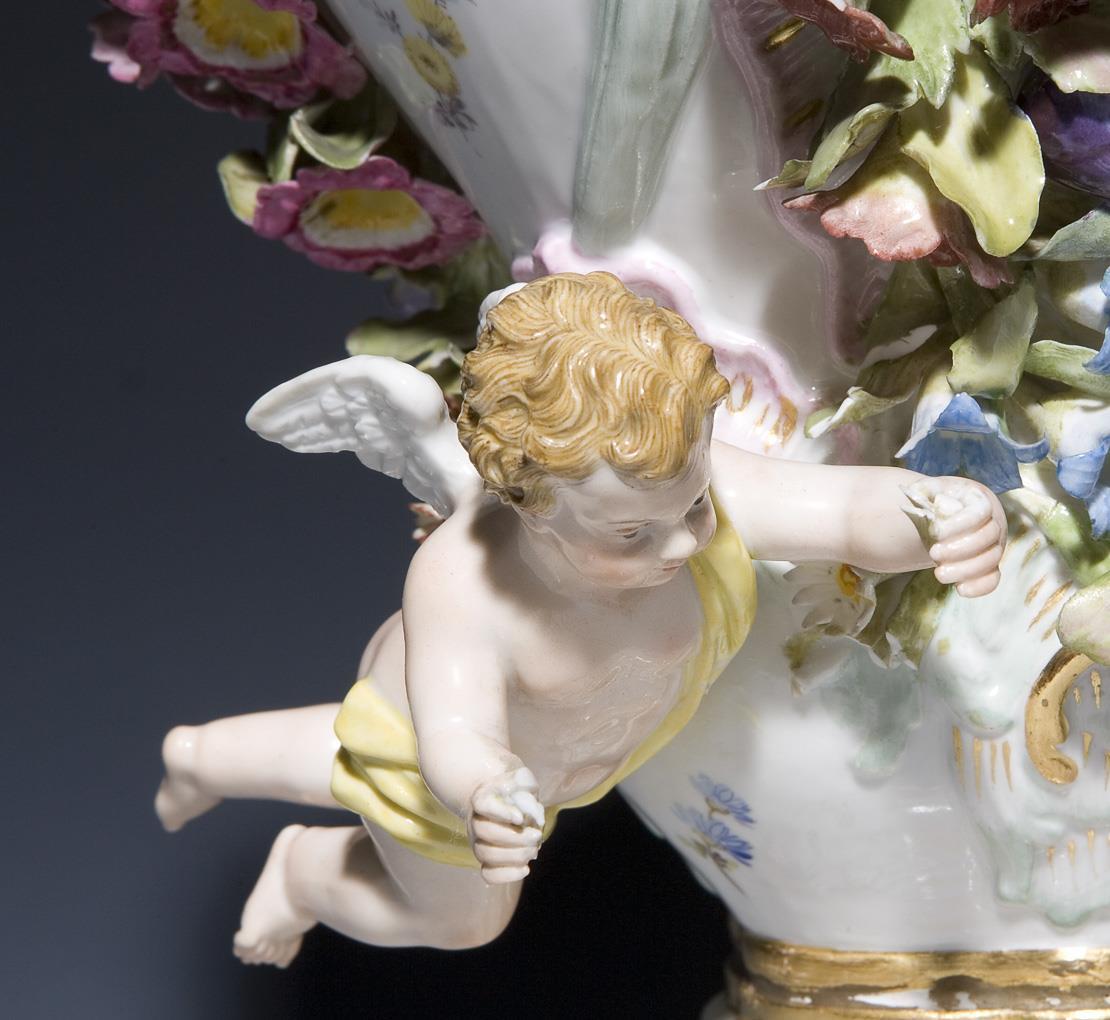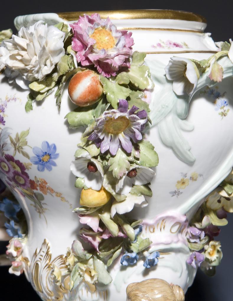 Modell von Johann Joachim Kaendler 1760. Reliefiert, farbig und gold staffiert. Umlaufend farbige Bemalung mit Blumenbuketts und Einzelblüten. Plastisch aufgelegte, naturalistisch bemalte Früchte und Blüten. Durchbrochen gearbeiteter Deckel mit plastischem Blumenbukett. Ritzmarken, Malermarke, Schwertermarke. Eine Amorette, ein Unterarm geklebt, zwei Füße, ein Daumen, ein Finger, Mündungs- und Deckelrand, einige Blüten, Blätter bestoßen.