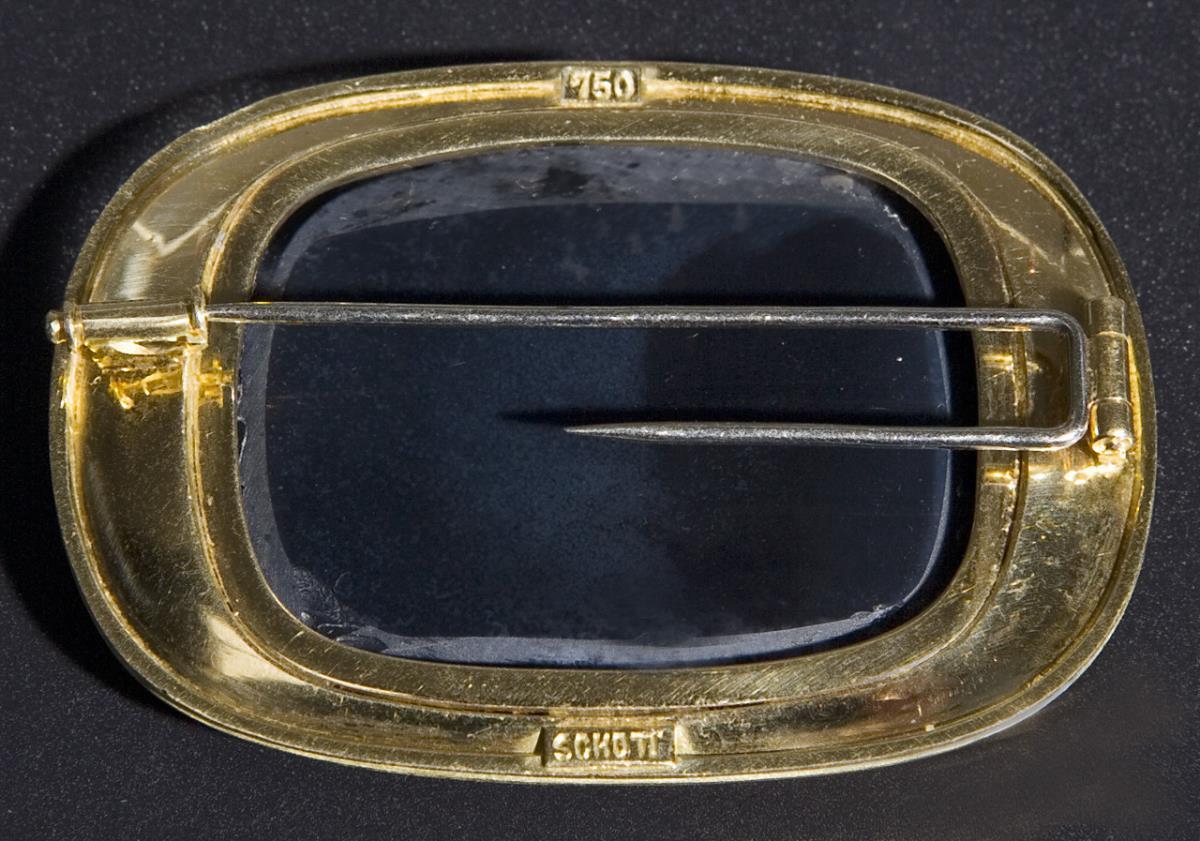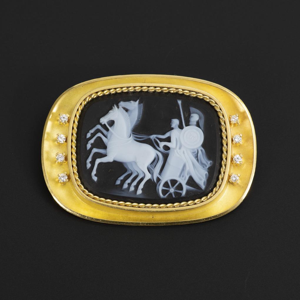 Juwelier Schott in Tübingen, signiert. Onyx-Lagenstein mit fein geschnittenem Dekor: Antiker Streitwagen. 8 kleine Brillanten in Krappenfassungen.