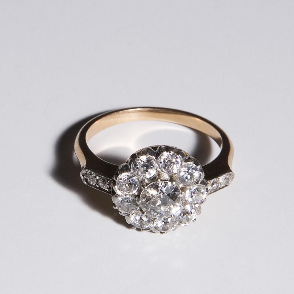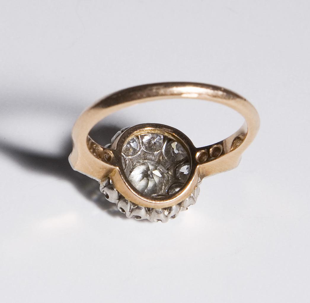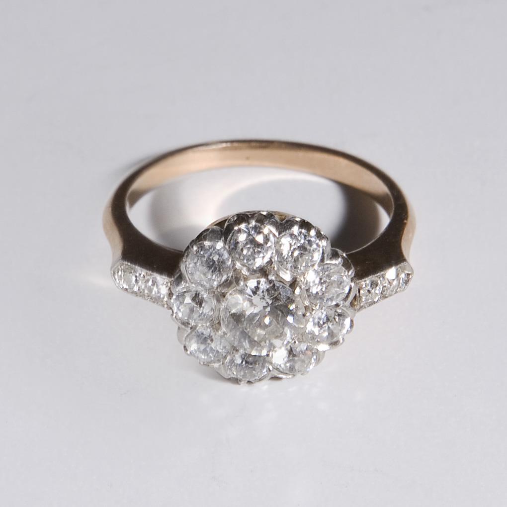 Mittig 1 Brillant circa 0,75 ct. 9 kleine Brillanten circa 0,9 ct. Seitlich 4 Diamantrosen. Wandung durchbrochen gearbeitet. Stabile volle Schiene.