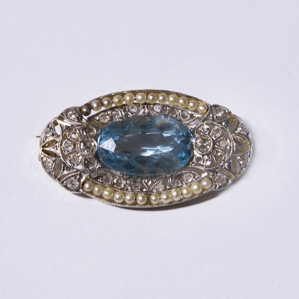 Ornamental durchbrochen gearbeitet. 1 facettierter Aquamarin, 2 kleine Diamanten, zahlreiche Diamantrosen, Flussperlchen. Brosche und Öse verbogen.