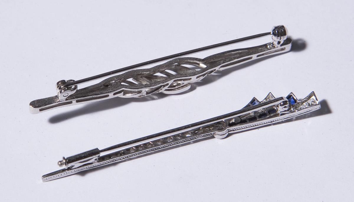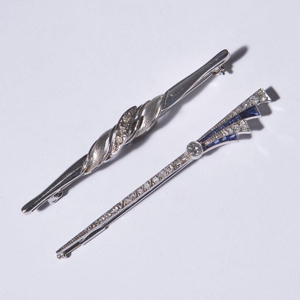 Andreas Daub, Pforzheim: 333er Weißgold (8 ct), mattiert und poliert, 3 Diamantrosen. 750er Weißgold (18 ct): 1 Brillant circa 0,1 ct, 5 kleine Brillanten, zahlreiche Diamantrosen, 12 kleine Saphir-Baguettes.